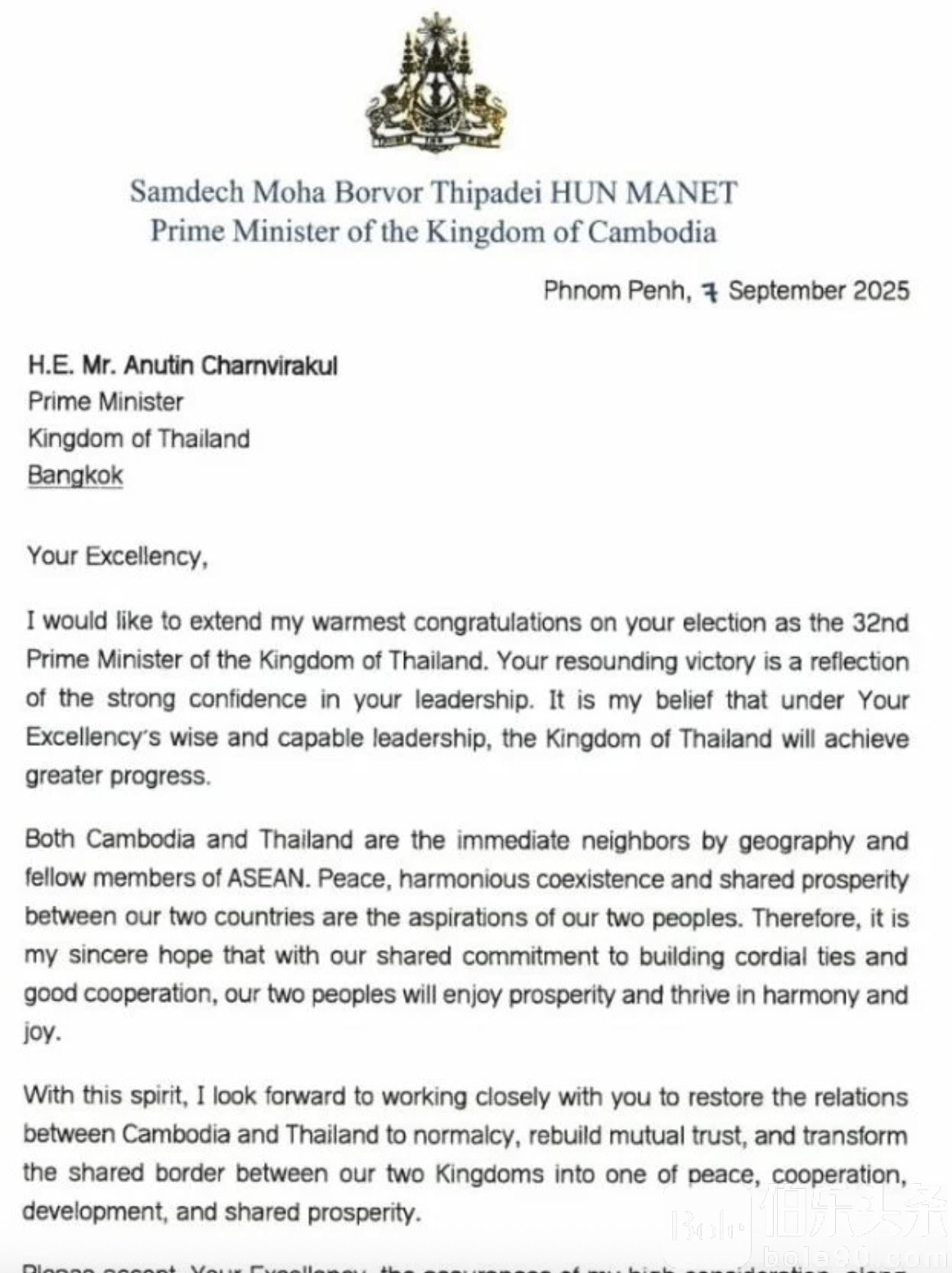 伯乐头条专讯:9月7日,柬埔寨总理洪玛奈在向泰国新任总理阿努廷致贺信时,表示期待两国修复关系、重建互信,并将边境打造成“和平与合作之地”。然而,在温和言辞的背后,柬泰边境的局势却早已陷入紧张对峙。
