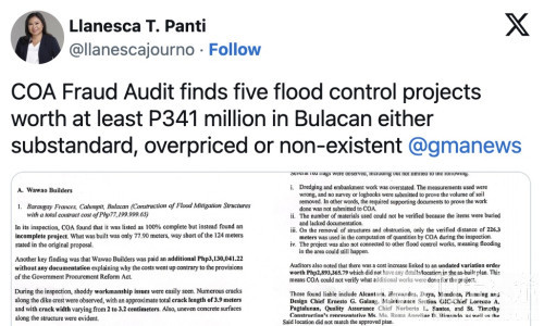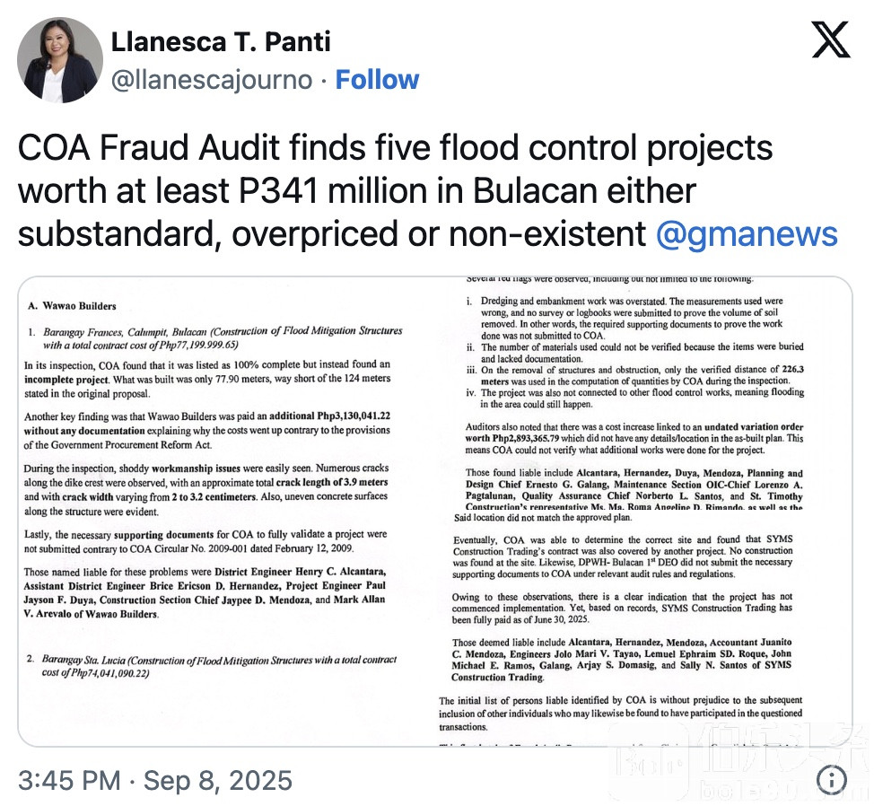 伯乐头条专讯:菲律宾公共工程与公路部(DPWH)再陷丑闻!审计署(COA)反舞弊小组近日披露,布拉干省多项总额超过3.41亿比索的防洪工程,竟存在偷工减料、虚报进度甚至“人间蒸发”的严重问题。涉案官员和承包商名单曝光,至少一名工程师已被确认将遭解职,更多人恐难逃法办。