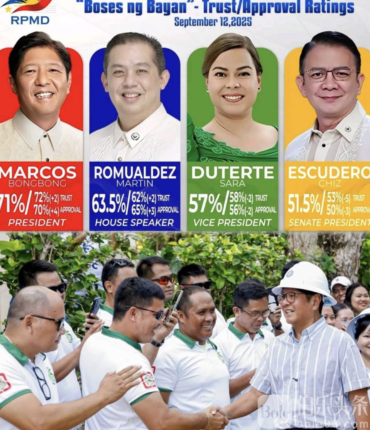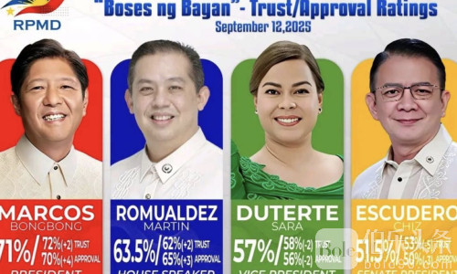 伯乐头条专讯:菲律宾RPMD机构于9月12日发布的“民声信任与支持度调查”显示,总统马科斯人气依旧高企,综合评分高达71%,而副总统莎拉·杜特尔特及参议院议长埃斯库德罗的支持率却出现下滑,反映政坛信任版图正在发生微妙变化。