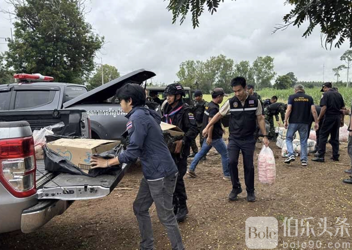 伯乐头条专讯:泰国沙缴府边境14日清晨,官兵在丛林甘蔗地查获近1吨疑似走私食品,包含奶粉、糖块、腌蒜水以及苦肠,初步认定为准备非法运往柬埔寨的货物,但未发现任何可追踪的所有人。
