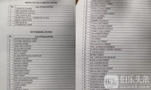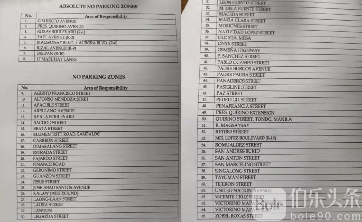 伯乐头条专讯:菲律宾马尼拉交通与停车局于9月16日发布了马尼拉市最新“绝对禁停”和“禁止停车”区域名单。此次公告旨在规范市区道路交通秩序,提醒市民和驾驶员注意相关禁停规定。