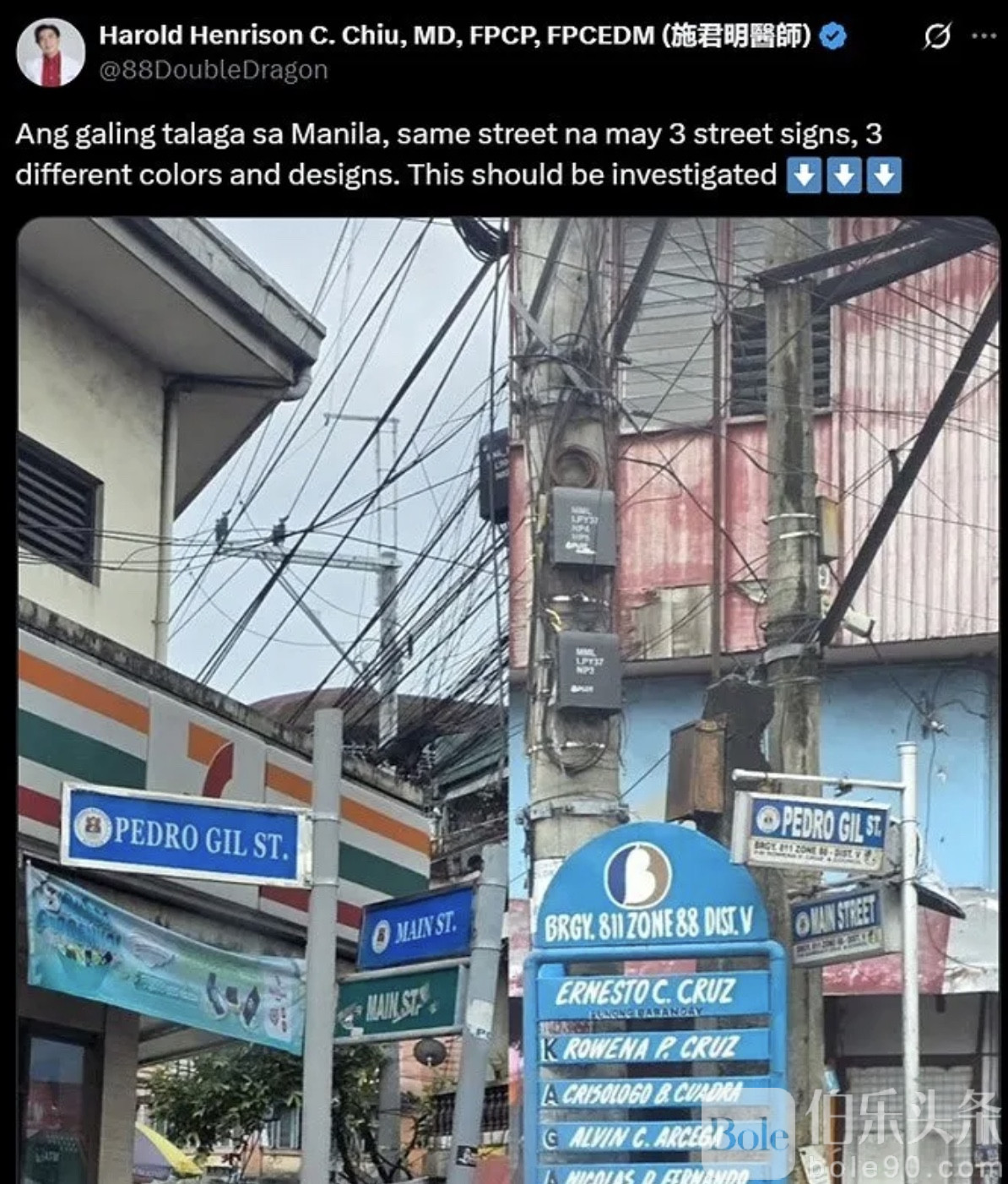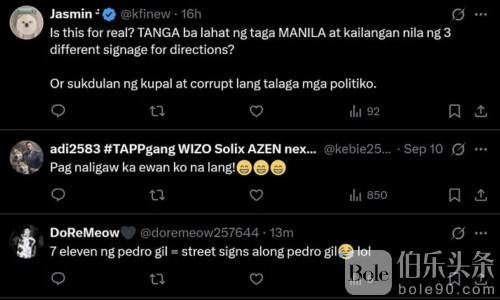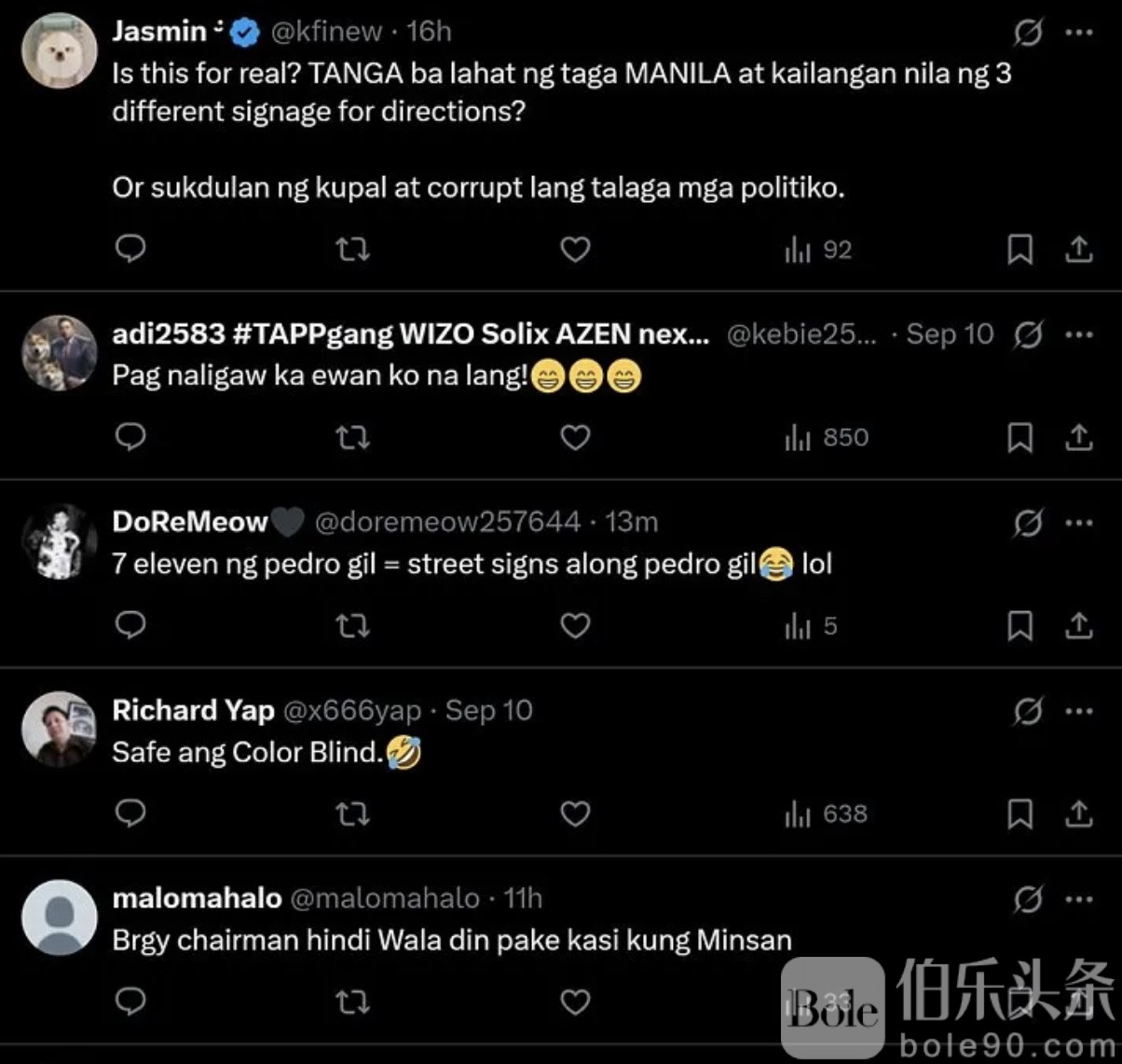 伯乐头条专讯:近日,马尼拉街头出现“同一路名多块路牌”的奇怪现象,引发民众热议和对政府公款使用的质疑。