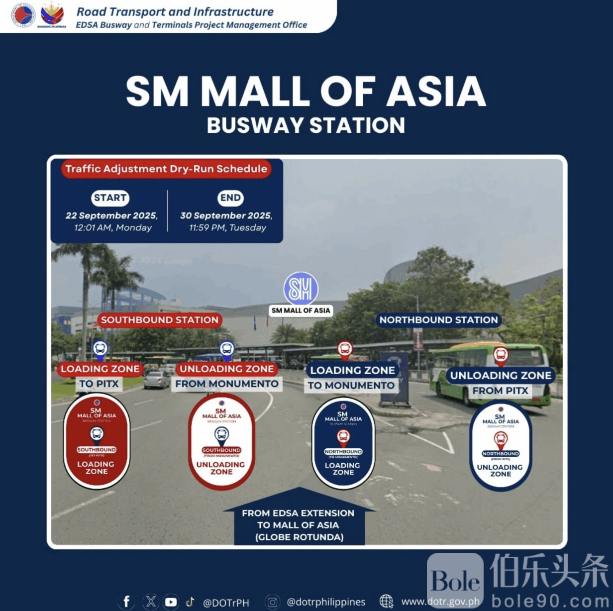 伯乐头条专讯:菲律宾交通部(DOTr)正式宣布,位于帕赛市SM亚洲购物中心(SM Mall of Asia,简称MOA)的全新北向公交专用道车站将于 10月1日 正式对外启用,届时通勤族的出行将更加便利。