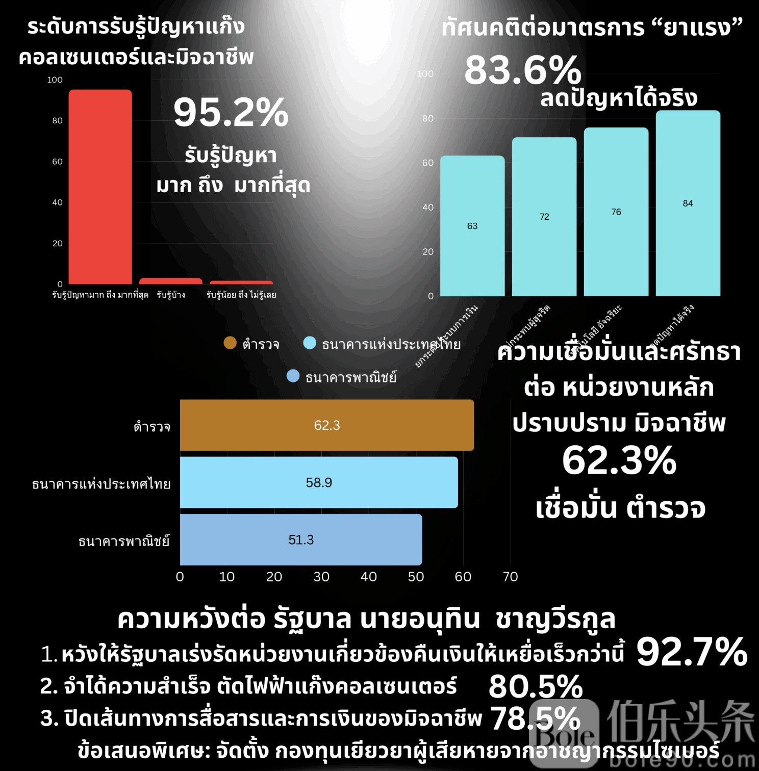 值得关注的是,民众对政府官员的反诈骗行动仍有记忆与期待。80.5%的受访者清晰记得总理阿努廷(Anutin Charnvirakul)曾成功打击电话诈骗集团的行动,92.7%希望政府加快返还受害者被冻结的资金。此外,78.5%希望政府继续封堵诈骗团伙的通信和金融渠道,74.6%希望加强与东南亚各国的跨国合作,73.4%则希望加大预算投入,建设实时数据与监管系统,确保警方、央行、商业银行及反洗钱部门联动高效。