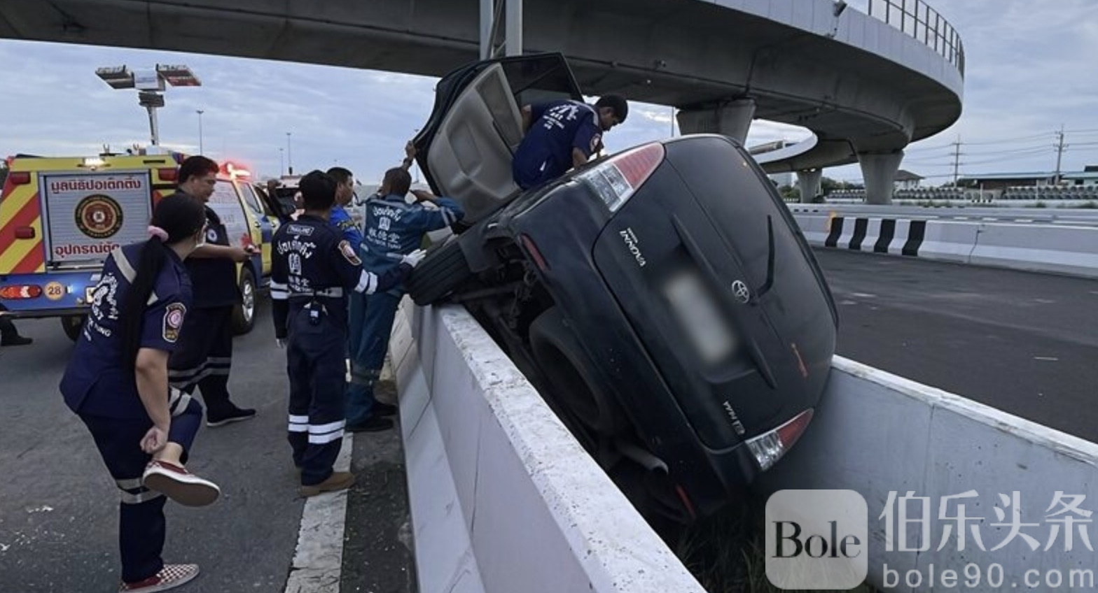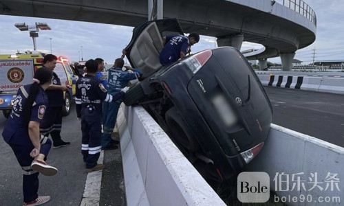 伯乐头条专讯:9月22日凌晨5时30分,泰国巴吞他尼府兰实段立交桥发生一起严重车祸,一辆载有9人的丰田轿车失控撞上路标柱,造成2人死亡、7人受伤的惨剧。