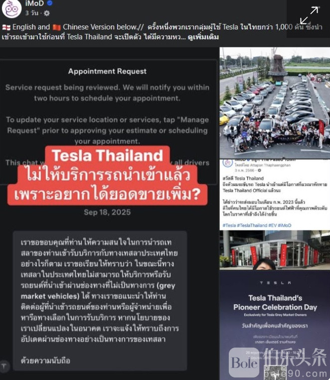 伯乐头条专讯:近日,泰国特斯拉车主在社交媒体上表达强烈不满,因为特斯拉泰国新管理层宣布,不再为“灰色市场”(非官方进口)车辆提供任何维修服务。即便是更换雨刷、空气滤清器等小问题,或通过TAB(特斯拉认证车身维修点)提出的保险索赔,也一律被拒受理。