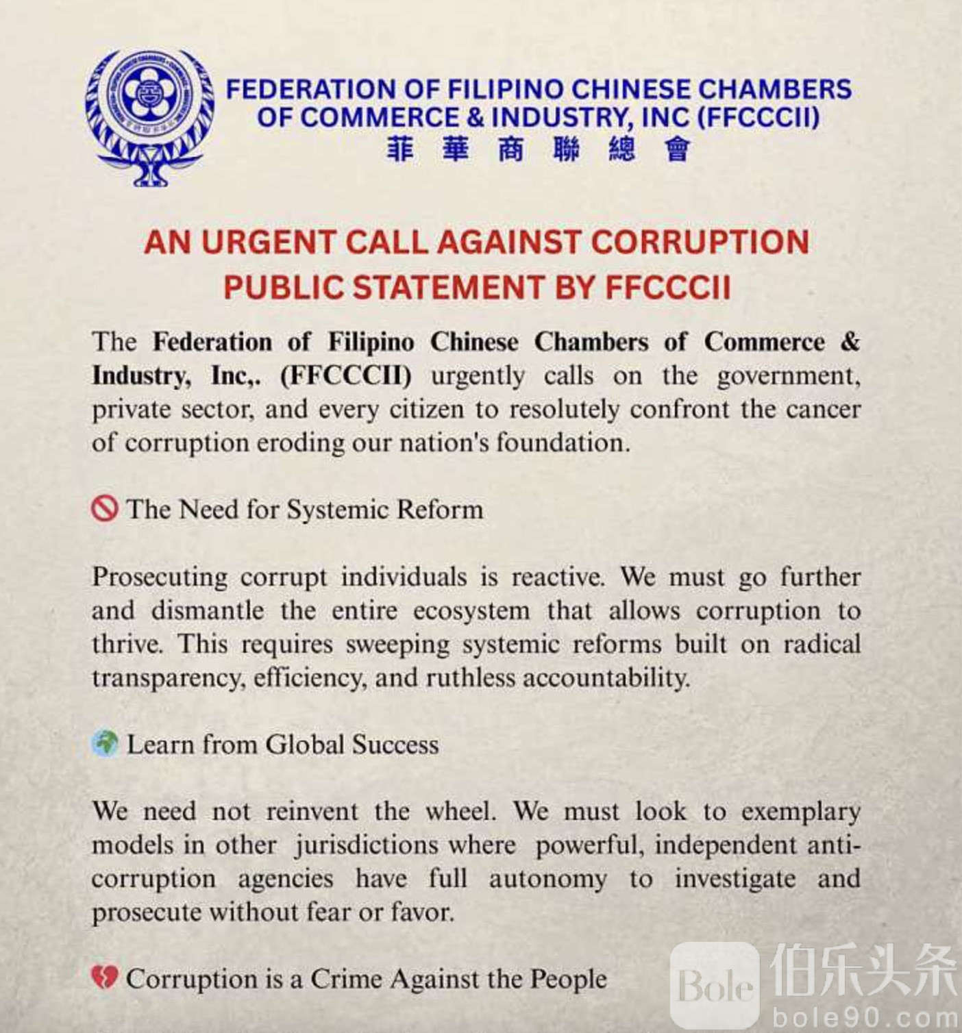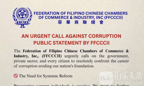 伯乐头条专讯:近期菲律宾反腐行动引发社会高度关注。9月21日,全国各地数十万民众走上街头,参加“万亿比索游行”,要求政府严惩腐败,并呼吁建立更加透明、公正的制度。9月22日,菲律宾华商联合总会(FFCCCII,商总)发表公开声明,紧急呼吁政府、私营部门及全体公民,坚决打击侵蚀国家根基的腐败行为。