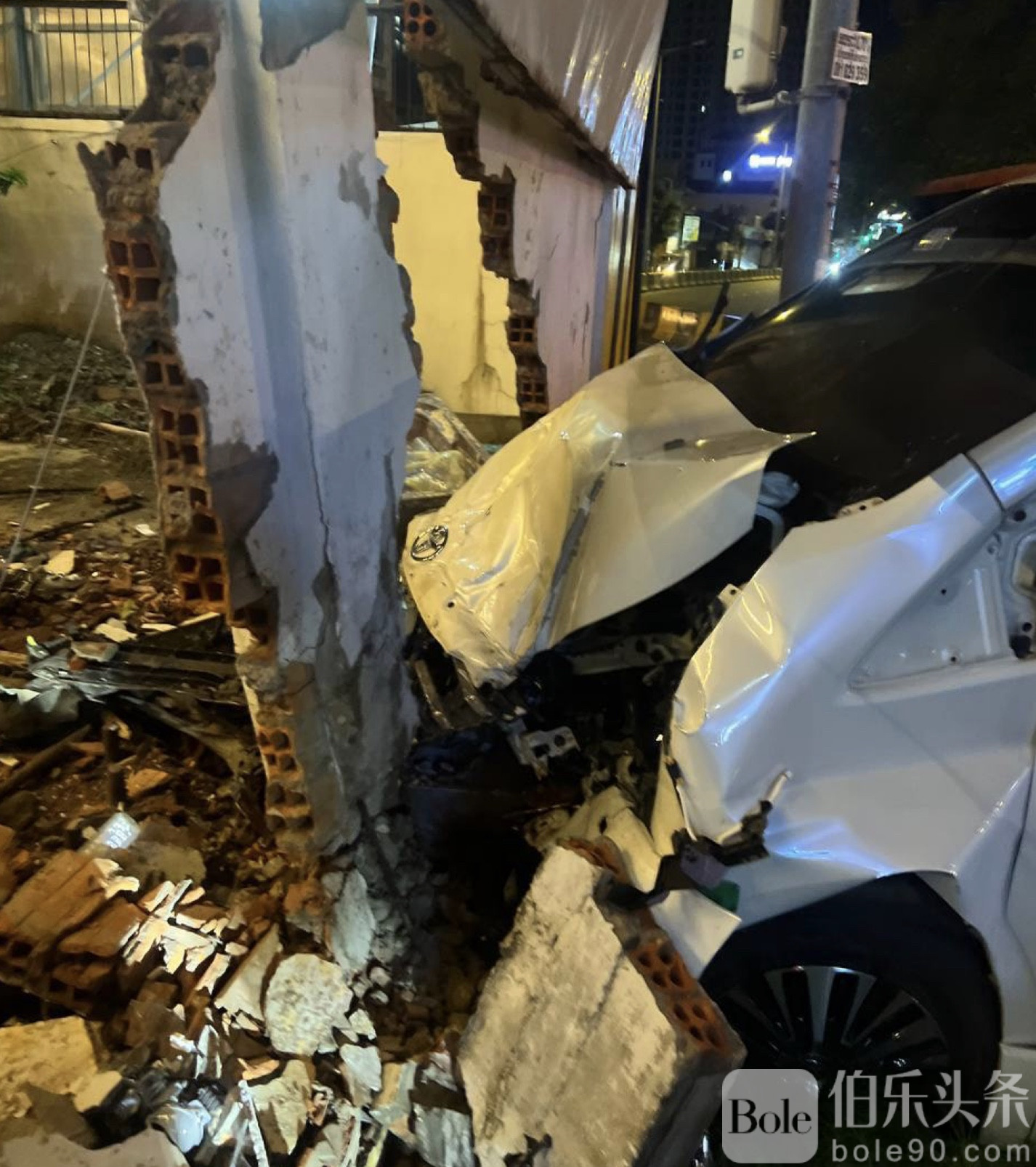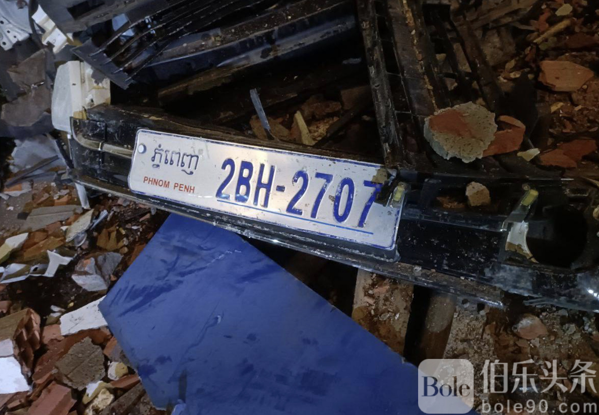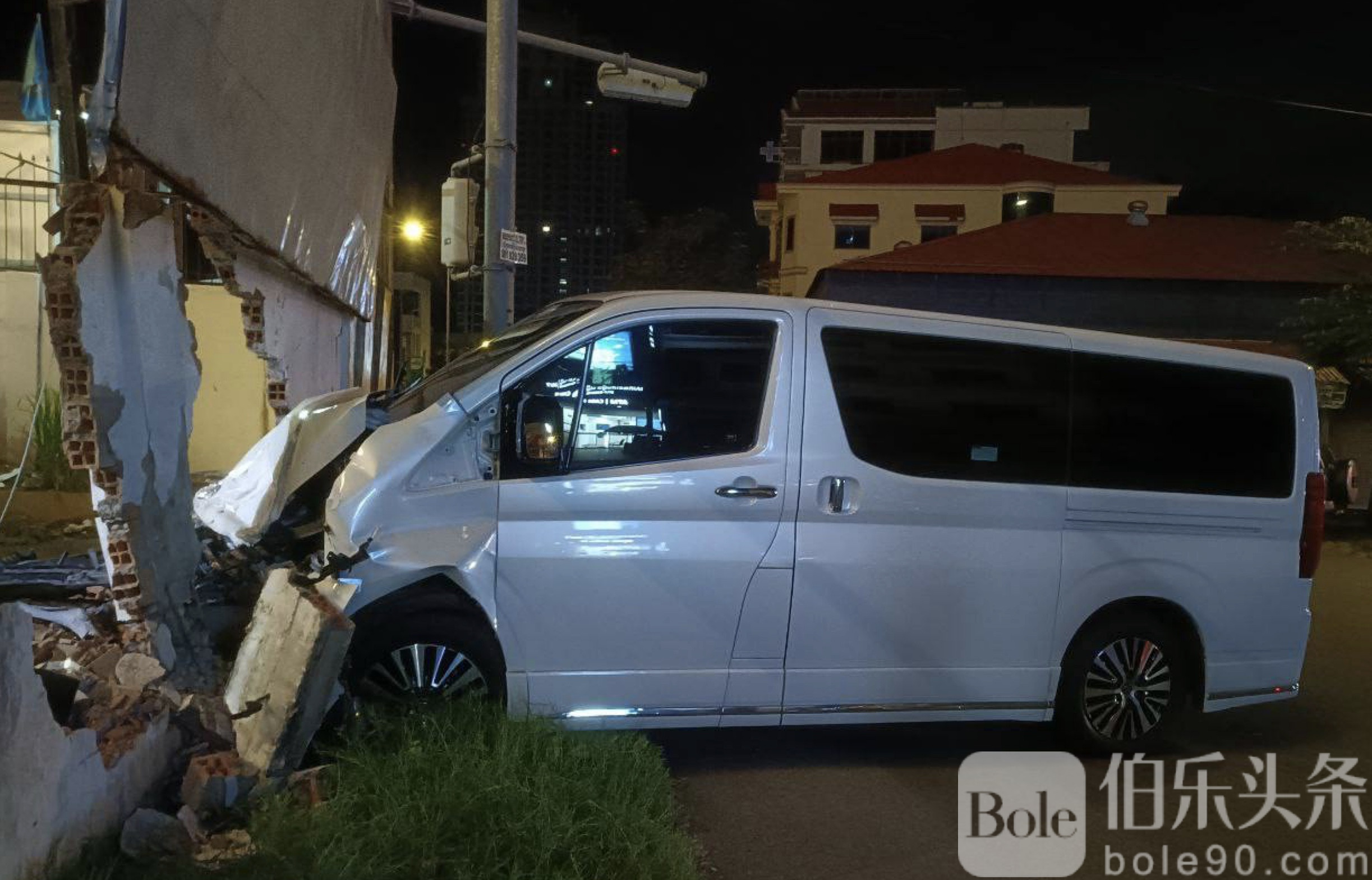 伯乐头条专讯:9月21日晚11时左右,柬埔寨金边堆谷区突发惊险一幕,一名外籍男子驾驶车牌号为2BH-2707的丰田轿车,突然高速冲撞柬埔寨国家电视台发射塔外墙,硬生生在围墙上凿出一个大洞,现场一度惊呼不断。
