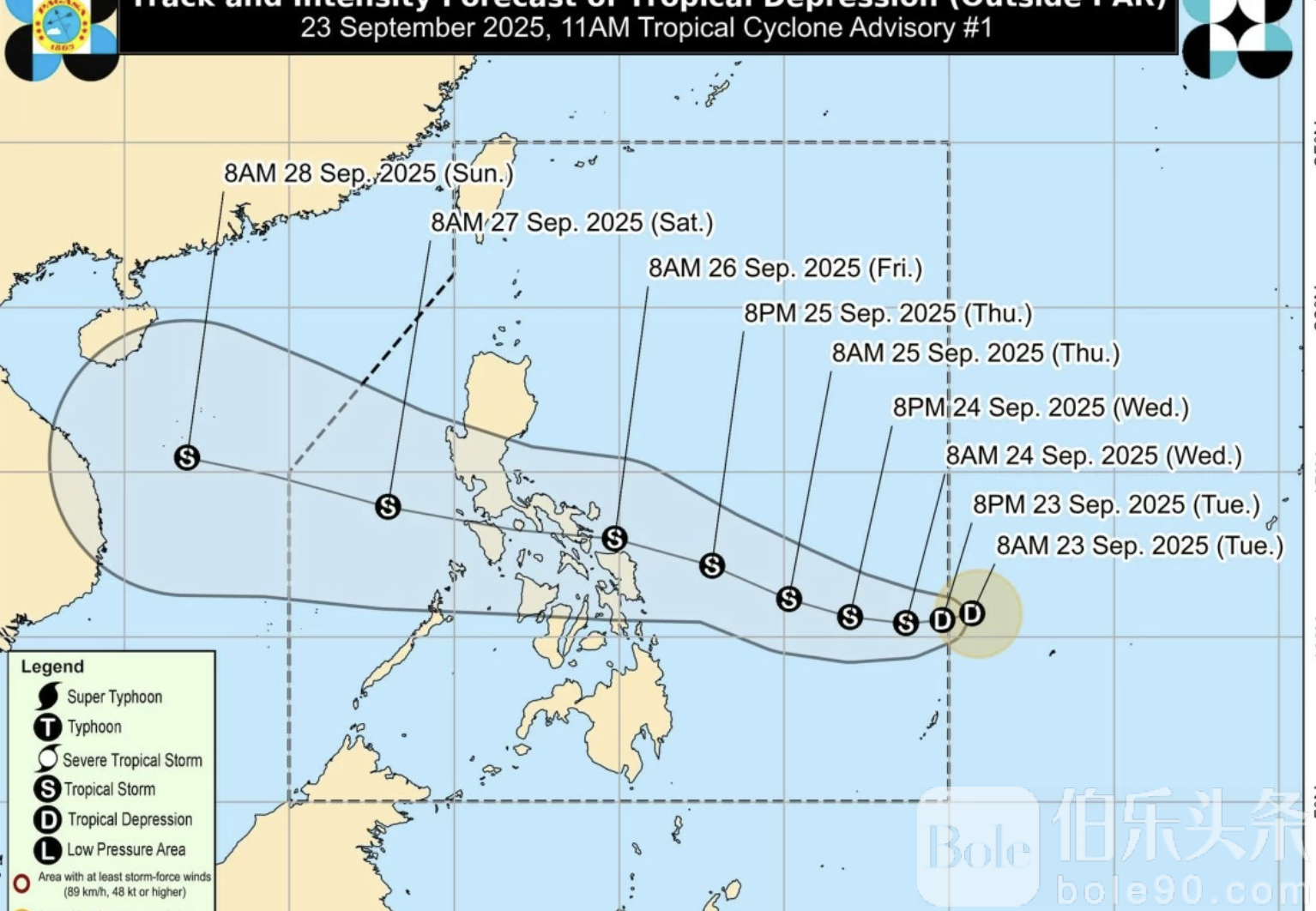 伯乐头条专讯:菲律宾气象局(PAGASA)23日早间通报,东米沙鄢以东海域的低压区已发展为热带低压,并将在今晚或稍晚进入菲律宾责任区(PAR),届时将被命名为“Opong”。