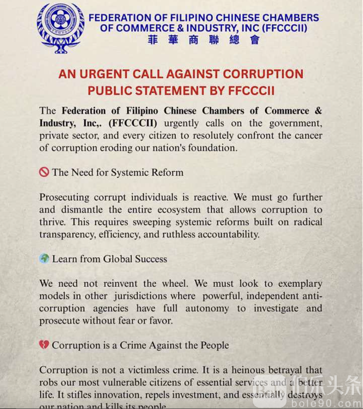 商总同时提醒,腐败并非无害,它直接侵害最弱势群体获得基本公共服务的权利,扼杀创新、排斥投资,甚至可能危及国家发展与人民生命安全。声明呼吁社会各界团结一致,建立奖励诚信的制度,为菲律宾的公正、繁荣与长远发展奠定基础。