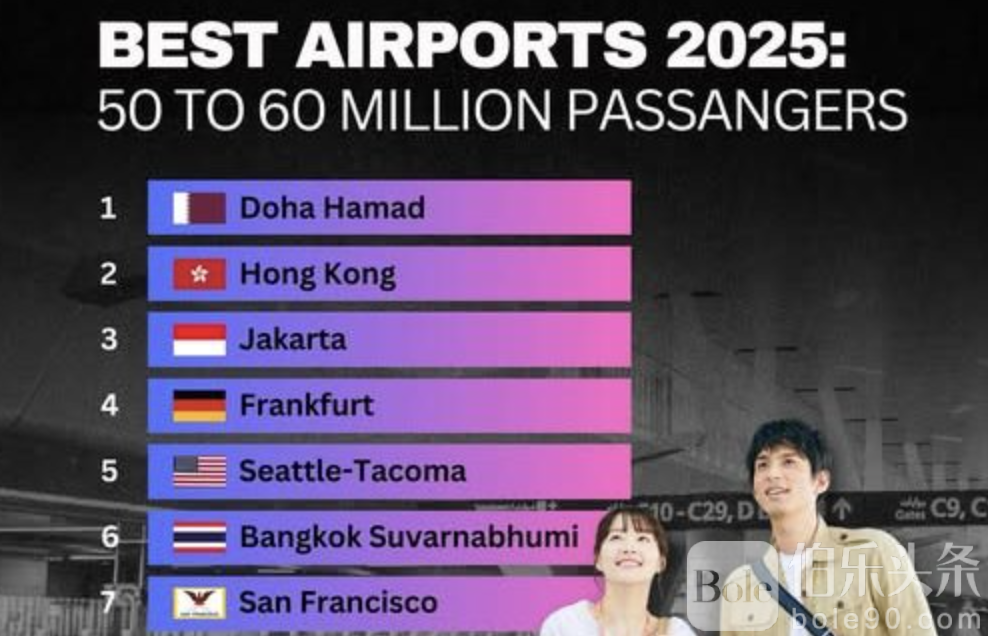 伯乐头条专讯: 国际航空服务评级机构 Skytrax 公布“2025年全球最佳机场排行榜”(年吞吐量5000–6000万人次类别)。卡塔尔多哈的哈马德国际机场凭借卓越的设计与高效服务稳居榜首,中国香港国际机场紧随其后,印尼雅加达苏加诺–哈达机场则意外跻身前三。