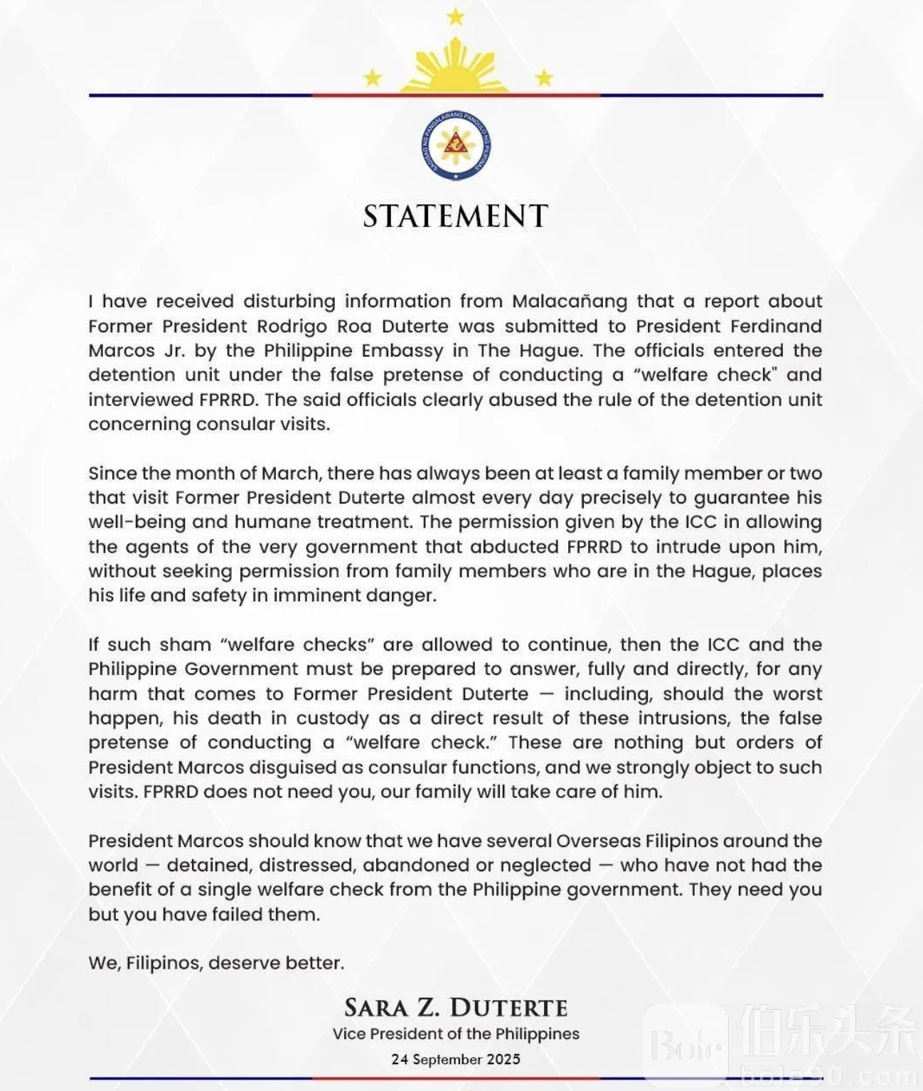 伯乐头条专讯:2025年9月24日上午9时,菲律宾副总统萨拉·杜特尔特在其脸书账号上火力全开,罕见发表措辞强烈的声明,谴责菲律宾驻海牙使馆人员以“福利检查”为借口,擅闯关押前总统罗德里戈·杜特尔特的拘留所,并对其进行问询。