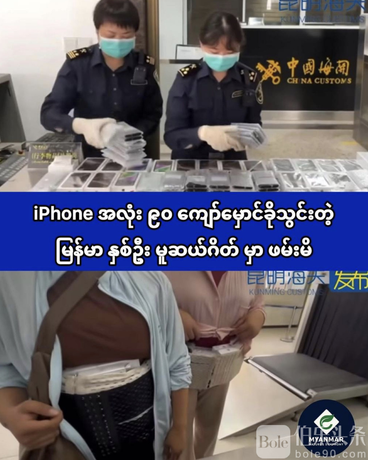伯乐头条专讯:近日,中缅边境木姐口岸上演一幕离谱走私案——一名中国籍女子和一名缅甸籍女子,竟然将多达91部iPhone绑在腰间,企图蒙混过关,结果在严格安检中当场被拦下。