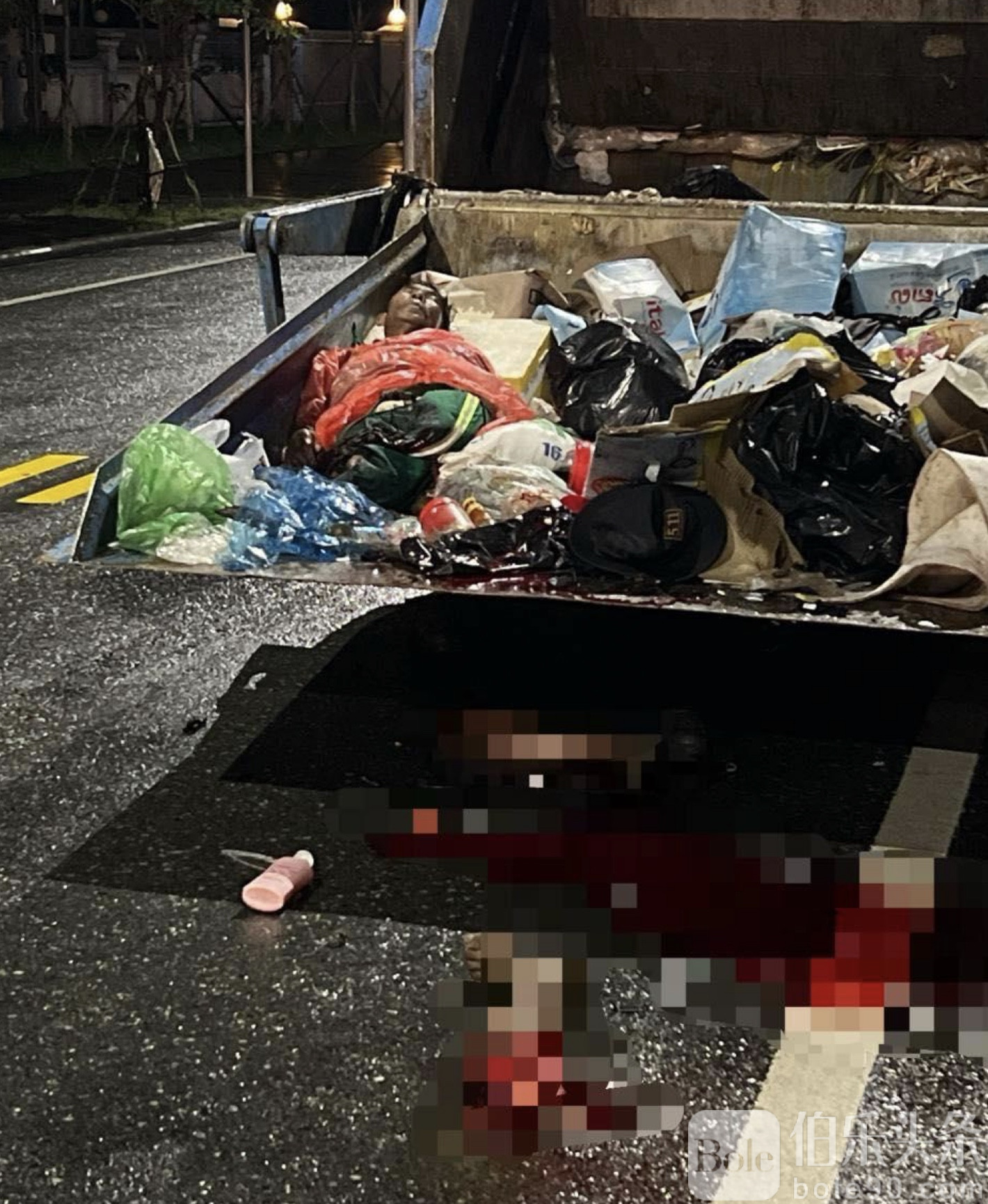 伯乐头条专讯:今天凌晨3点左右,柬埔寨西哈努克市(西港)发生一起惨烈车祸。一名在垃圾车后拾荒的老人,被一辆疾驰而来的豪华小车从后方猛烈撞击,当场双腿粉碎性骨折,在送医途中不幸身亡。
