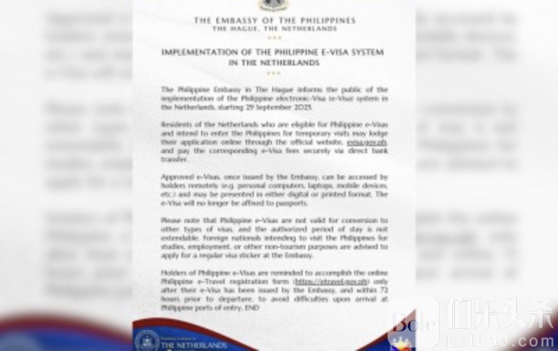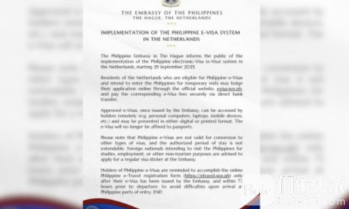 伯乐头条专讯:菲律宾驻海牙大使馆于周一正式上线菲律宾电子签证(e-Visa)系统,为荷兰居民及符合条件的申请者提供便捷的短期入境手续。根据大使馆声明,旅客可通过官方门户网站 evisa.gov.ph 在线提交签证申请,并通过银行转账安全支付相关费用。