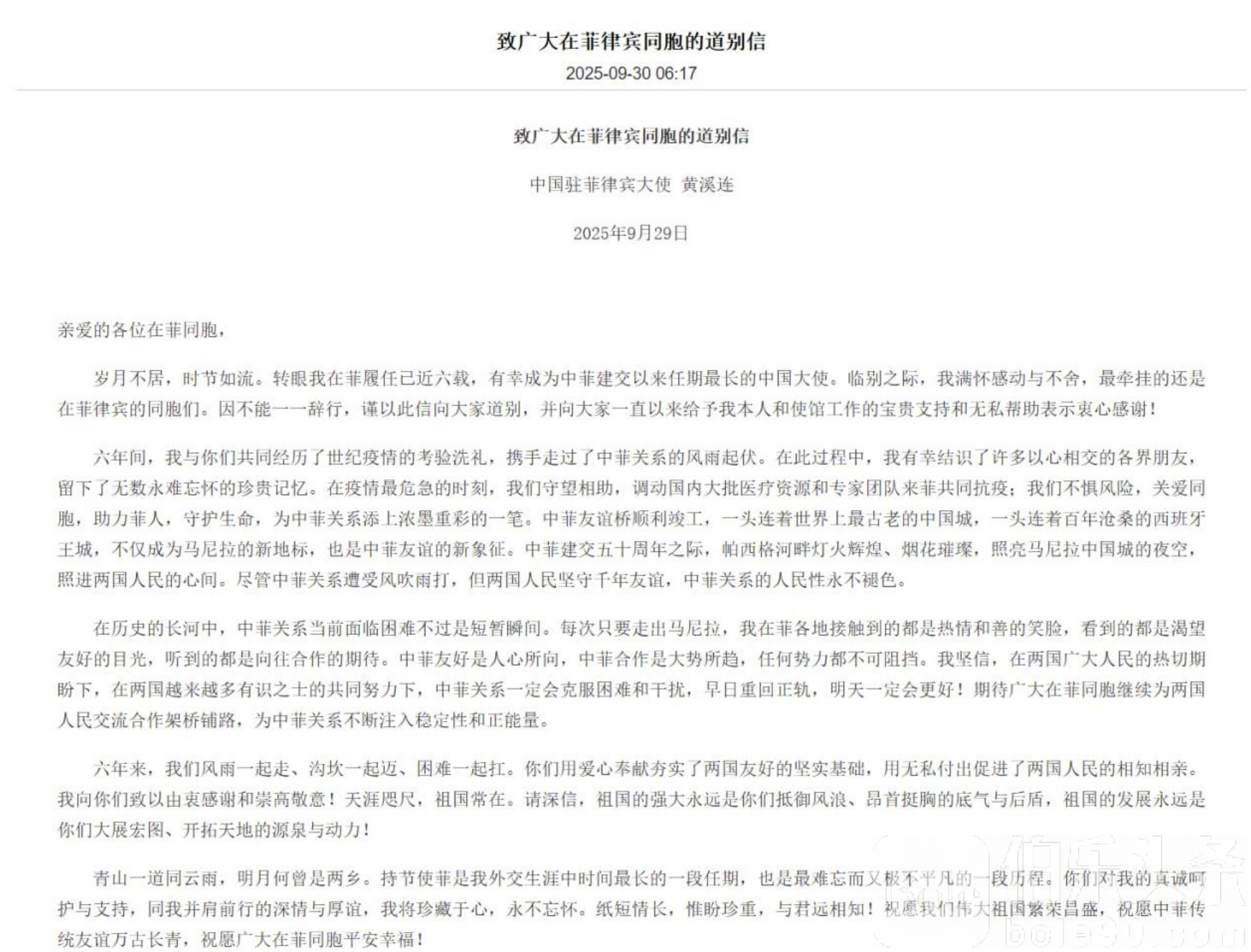 岁月不居,时节如流。转眼我在菲履任已近六载,有幸成为中菲建交以来任期最长的中国大使。临别之际,我满怀感动与不舍,最牵挂的还是在菲律宾的同胞们。因不能一一辞行,谨以此信向大家道别,并向大家一直以来给予我本人和使馆工作的宝贵支持和无私帮助表示衷心感谢!