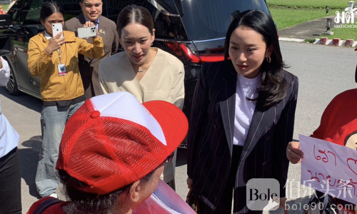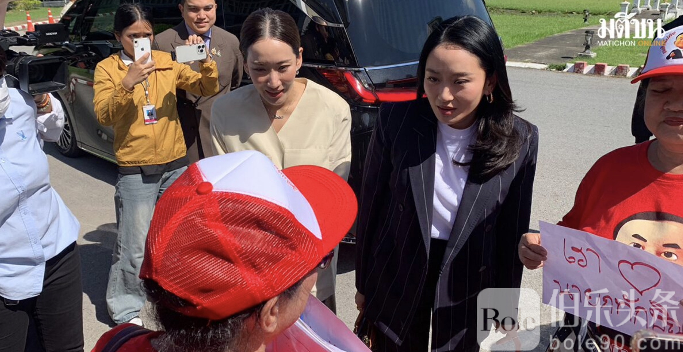 在进入监狱前,两姐妹还与狱外聚集的红衫军成员合影留念。部分支持者手举写有“钦那瓦加油”“只要为泰党”“我们爱他信”的标语,场面颇为热烈,显示出他信家族在泰国政坛依旧拥有强大的支持基础。
