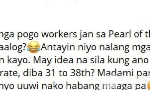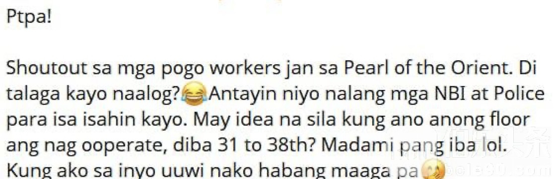 投稿内容直白又刺眼,句句戳中 POGO 人员的痛点:开头就用 “Ptpa!”喊话东方明珠的 POGO 从业者,调侃 “你们真的没被吓到吗?”;紧接着直接 “泄底”——NBI 和警察 “已经知道是哪些楼层在运营了,不是 31 到 38 层吗?还有很多其他的”,语气笃定,仿佛亲眼所见。