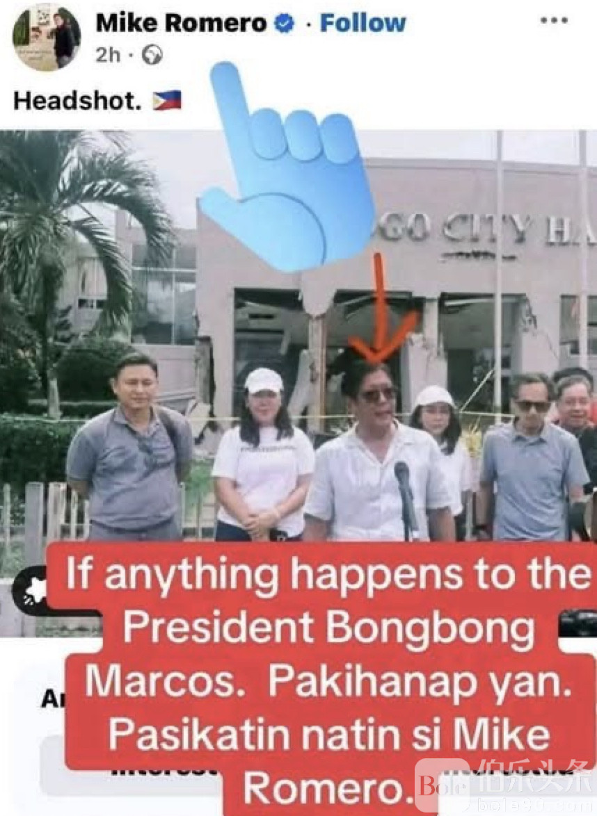 警方透露,这名男子名叫 Michael “Mike” Romero,他在 Facebook 上发布了一张菲律宾总统小马科斯的照片,并在画面中加上一个红色箭头指向总统头部,标题写着 “Headshot(爆头)”。