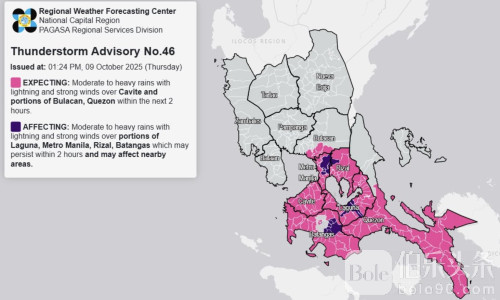 伯乐头条专讯:菲律宾气象局(PAGASA)周四下午发布雷暴警报,指出马尼拉都会区及吕宋岛三省部分地区正经历中到大雨,伴随雷电与强风,局部地区可能面临洪水和滑坡风险。