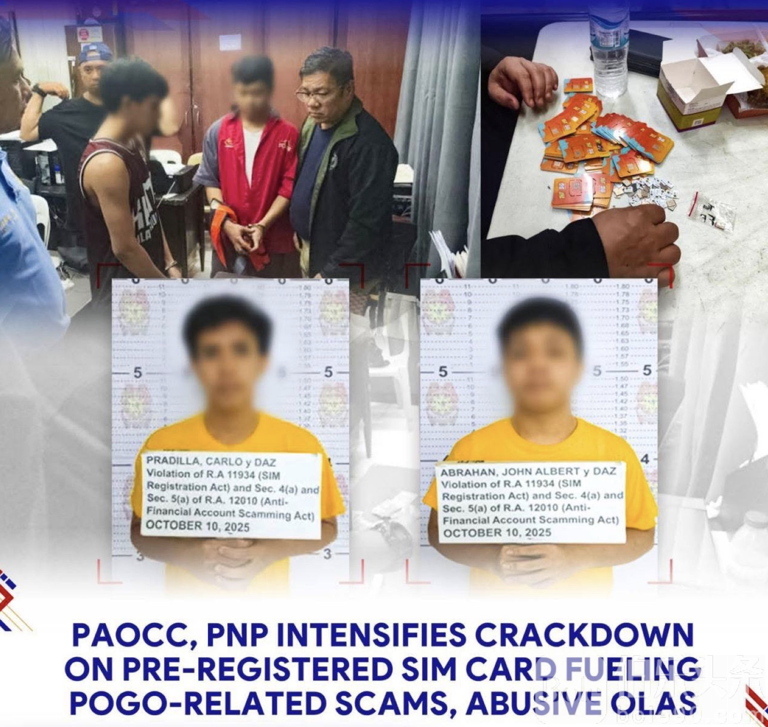 伯乐头条专讯:10月9日,菲律宾总统反有组织犯罪委员会(PAOCC)与国家警察(PNP)在帕拉尼亚克苏卡特一座加油站展开诱捕行动,当场逮捕两名非法SIM卡贩子——卡洛・达兹与约翰・阿布拉罕・达兹,查获240张登记在假名下的“隐身卡”。这场看似普通的突袭,实则揭开了POGO诈骗、网贷勒索等跨国犯罪赖以生存的幕后供应链。
