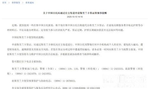 使馆强调,斯里兰卡签证应通过斯里兰卡移民局官方网站或正规官方途径申请,不应轻信任何个人或中介的“包办”“加急”“内部渠道”等虚假承诺。