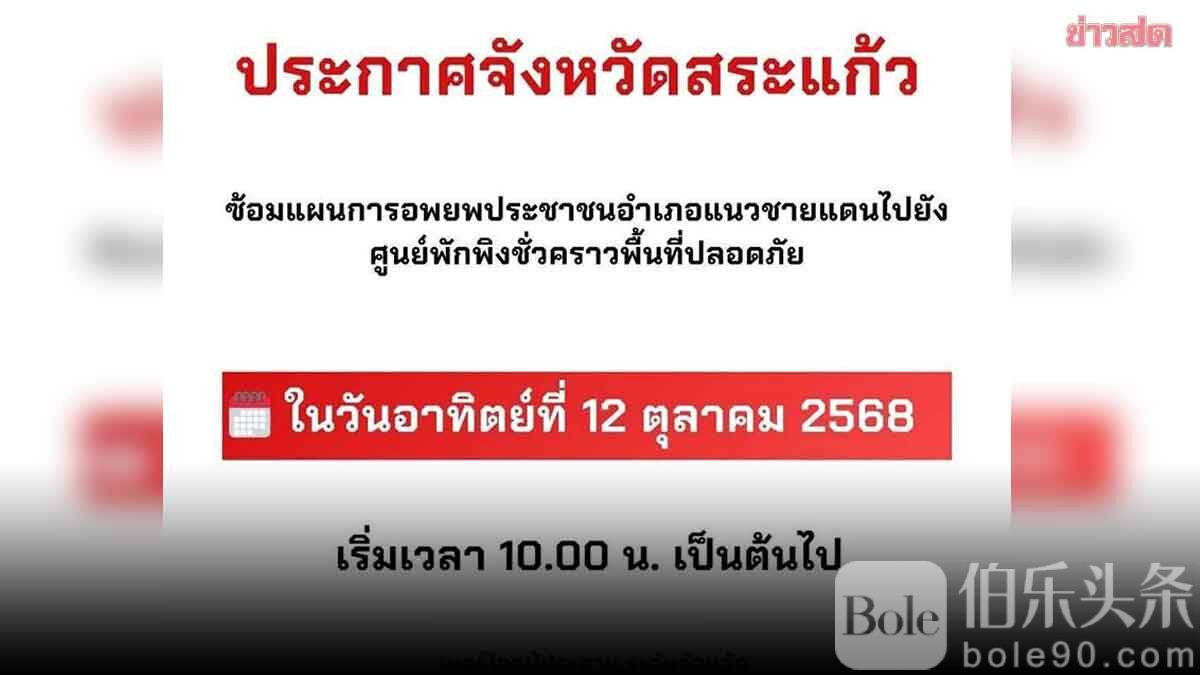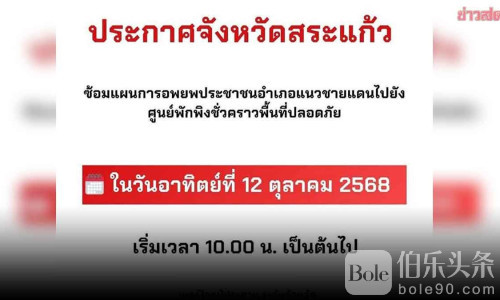 伯乐头条专讯:泰国沙缴府发布公告,提醒边境居民将于2025年10月12日开展应急疏散演练,前往临时避难所以应对突发情况。演练将于上午10点开始,当地居民被要求听从官员指挥,保持警惕,并密切关注最新公告,以确保自身安全。