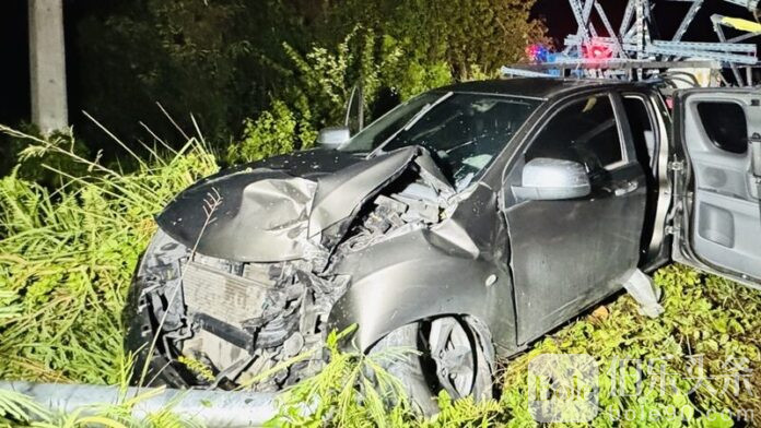 事故发生在当晚19时30分,地点位于市区帕克那(Pak Nakhon)分区的诗丽那空三岔路口。死者为当地建材店员工,骑乘一辆黑色本田摩托车准备右转入支路时,被对向疾驰而来的承包商皮卡猛烈撞击。现场摩托车几乎全毁,皮卡车头凹陷,路边电线杆也被撞断。