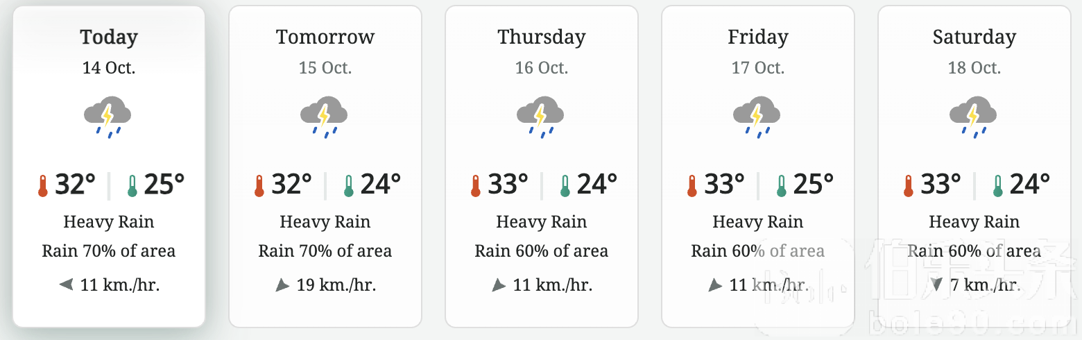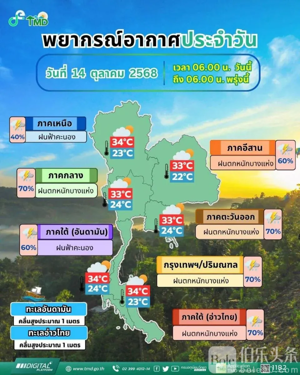伯乐头条专讯:泰国气象局(TMD)于10月14日发布最新天气预警,预计全国47个府将出现强降雨和大风天气,曼谷及周边地区将有约70%的区域出现明显降雨,部分地区或将出现暴雨与突发性洪水风险。
