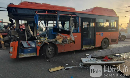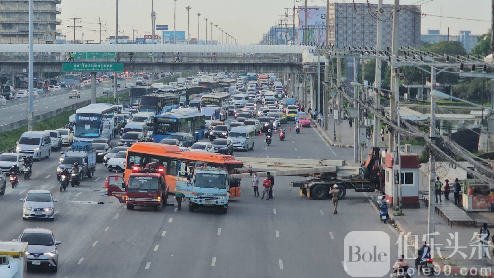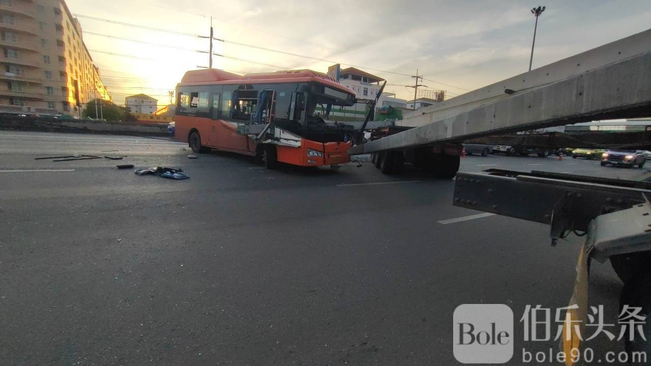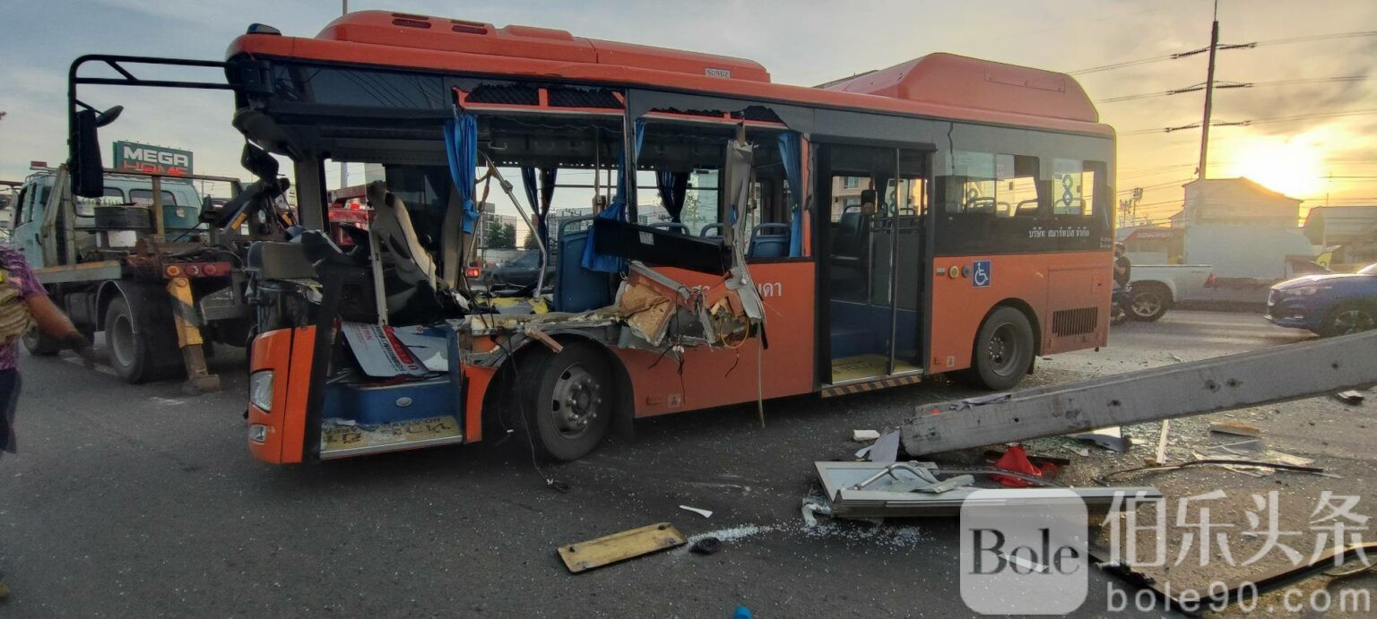 事故发生在10月23日凌晨5点30分,地点位于巴吞他尼府孔銮区帕洪育庭公路(Klong Luang, Pathum Thani)曼谷大学前路段。警方与救援人员到场后发现,公交车车头严重变形,混凝土桩从车头刺入驾驶区,碎玻璃散落一地,导致交通严重受阻,车龙一度延伸超10公里。