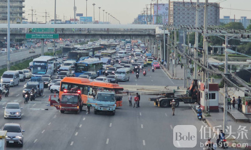 伯乐头条专讯:泰国今晨发生惊险车祸!一辆从曼谷开往郊区的39路空调公交车在凌晨时分撞上运送混凝土桩的拖车尾部,22米长的桩体直接贯穿公交车车头玻璃,现场一片混乱,所幸车上无乘客,仅司机与售票员两人受伤。