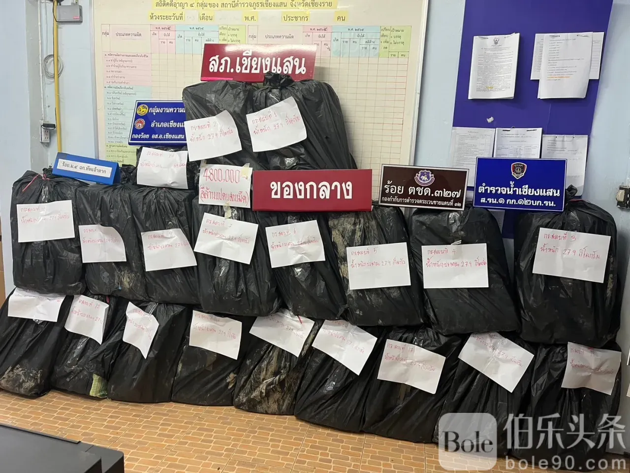 伯乐头条专讯:泰北清莱再破巨量毒品走私案!警方在清盛县边境路段设伏截获一辆可疑皮卡车,当场查获毒品“冰毒片”(Yaba)约480万粒,重达536公斤,估值数亿泰铢。司机见势不妙跳入湄公河逃逸,目前仍在追捕中。