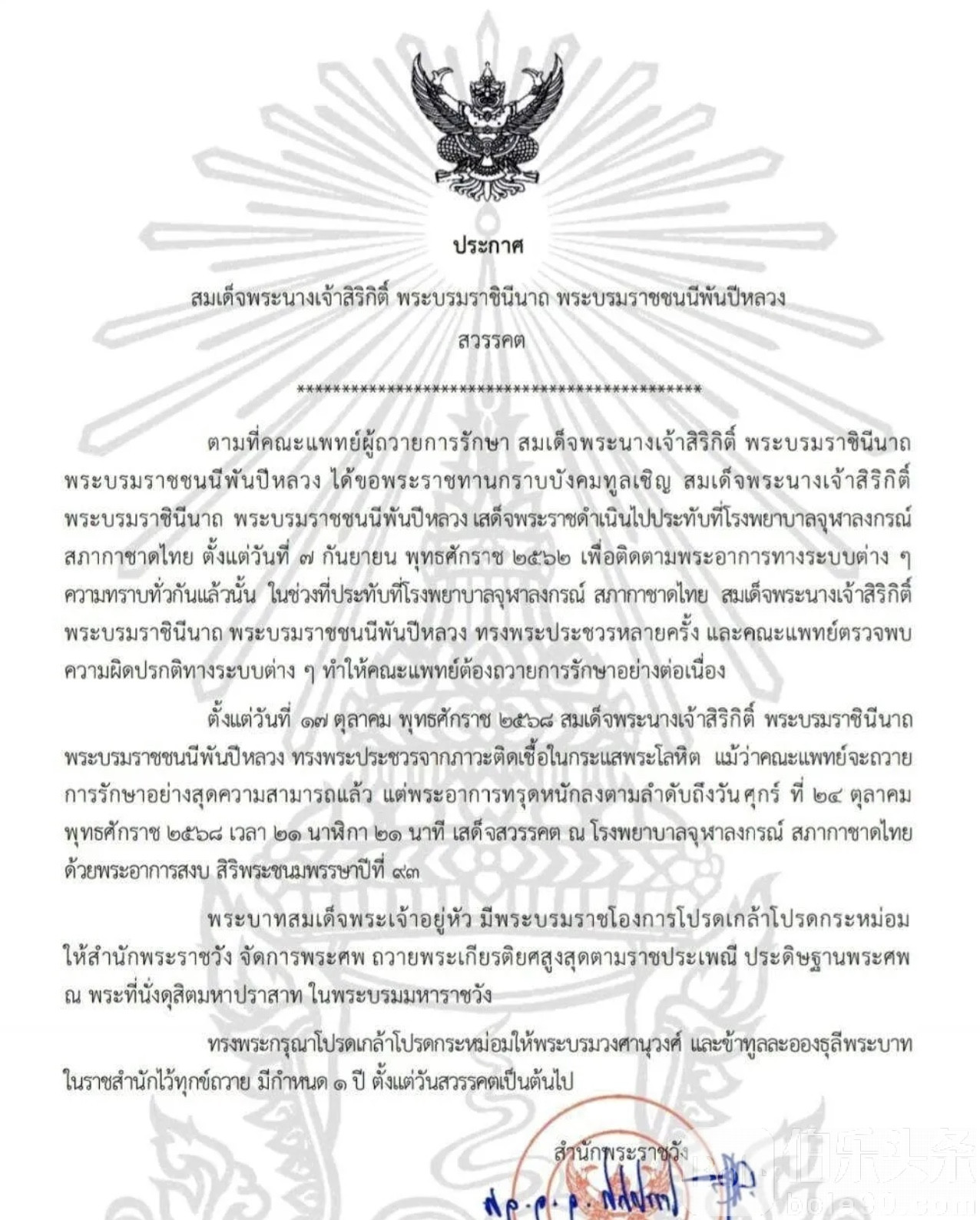 伯乐头条专讯:泰国王室府今日凌晨发布沉痛公告,宣布诗丽吉太后于2025年10月24日21时21分在朱拉隆功纪念医院安详辞世,享年93岁。消息传出后,举国陷入悲恸,民众纷纷前往王宫与寺庙献花悼念。