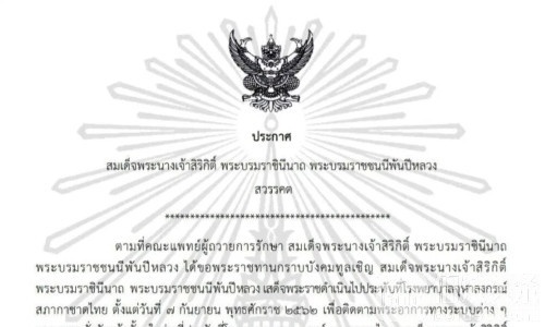 公告中指出,自2019年9月7日起,诗丽吉太后因多项慢性系统性疾病在朱拉隆功纪念医院长期接受治疗。期间病情数度恶化,医护团队多次实施全力救治。2025年10月17日起,太后因血液循环系统感染(菌血症)病情急转直下,尽管医疗团队竭尽所能,仍未能挽回太后生命。