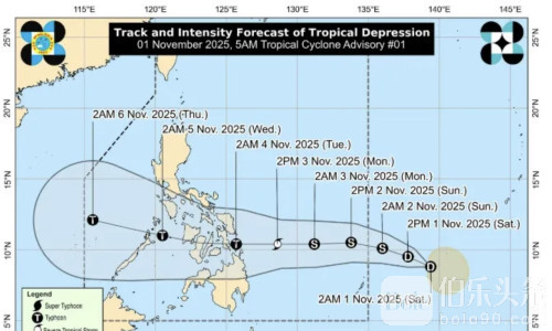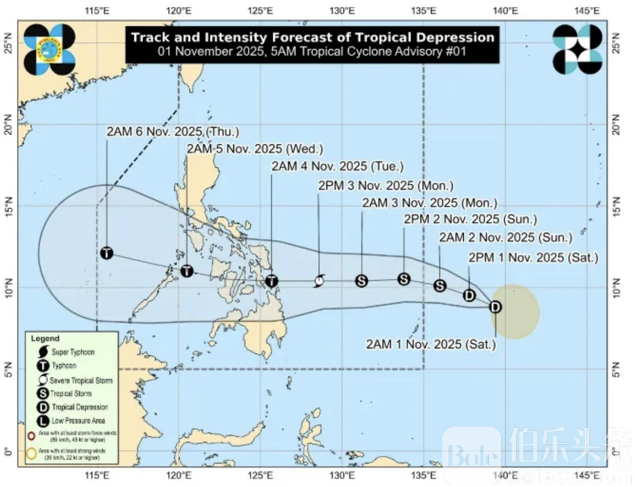 伯乐头条专讯:菲律宾气象局(PAGASA)于 11月1日(星期六) 发布最新预警称,位于棉兰老岛东北方外海的低气压区已发展为热带低气压,预计将在 11月2日 正式进入菲律宾责任区(PAR)。一旦进入,该系统将被命名为“蒂诺”(Tino)。