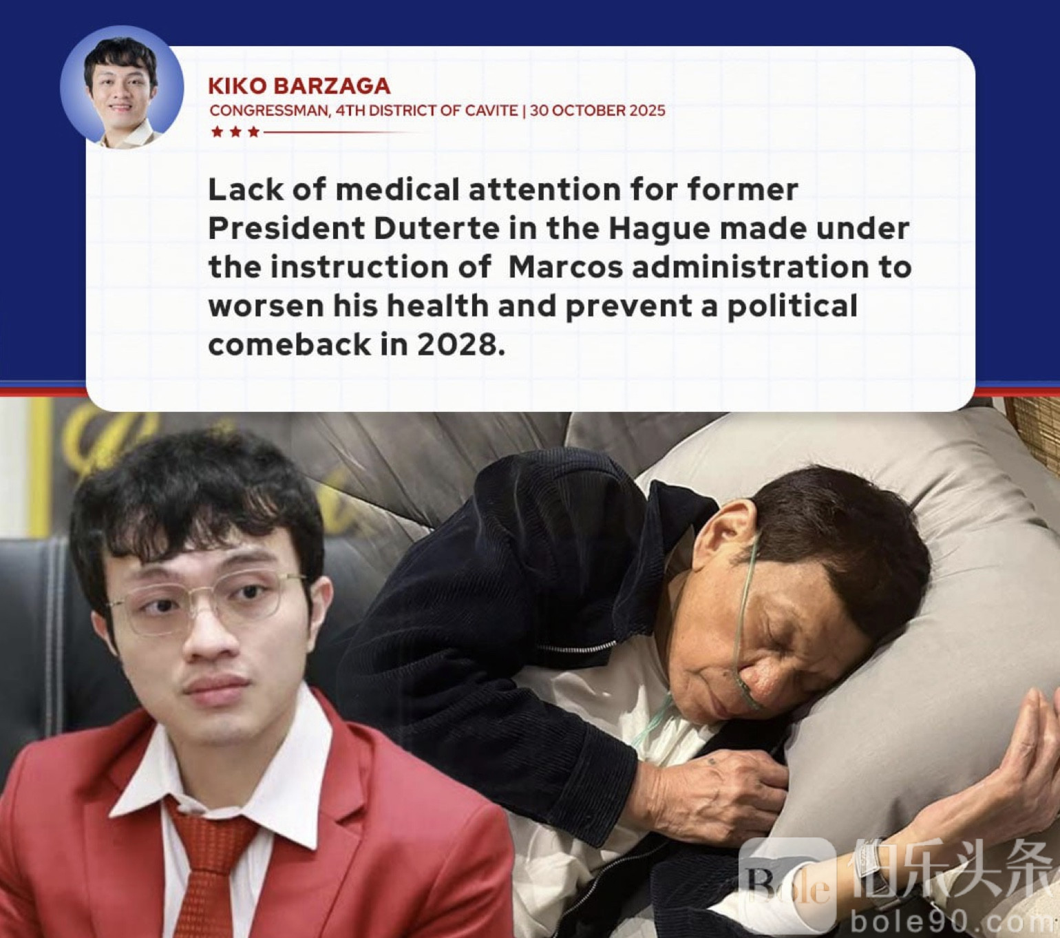 伯乐头条专讯:甲美地省国会议员埃尔皮迪奥·“基科”·巴尔扎加(Elpidio “Kiko” Barzaga)近日公开指控,前总统罗德里戈·杜特尔特(Rodrigo Duterte)在荷兰海牙期间疑似未能获得应有的医疗照护,而这一切“可能是现任政府刻意为之”,目的是削弱老杜的健康状况,阻止他在2028年东山再起。