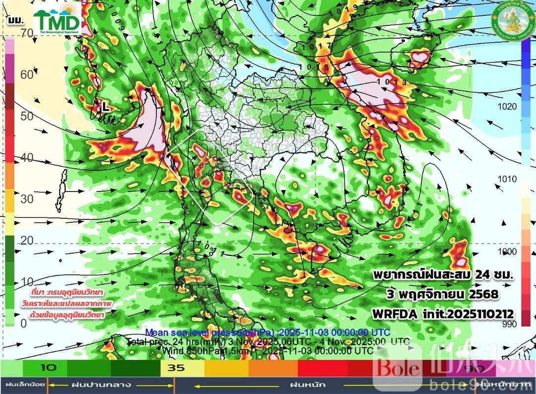 伯乐头条专讯:泰国气象局更新未来10天天气预报显示,11月3日全国多地仍有持续降雨,尤其是北部、中部西部、东部、曼谷及周边地区以及南部上半部。受冷空气南下及上南部季风槽影响,局部地区将出现大雨,公众需防范短期强降水,并注意健康与出行安全。农户应做好农作物防护措施。沿泰湾南部沿海风浪增强,局部海域作业需谨慎。