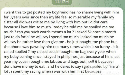 女子表示,她并不丑,与其他女性不同,但却被男友言语羞辱,常常责怪和贬低她。她质问:“难道所有中国男人都如此无礼又残忍吗?”她在投稿中直言不讳,男友甚至连5000比索的正常开销都不愿支付,令她心灰意冷。