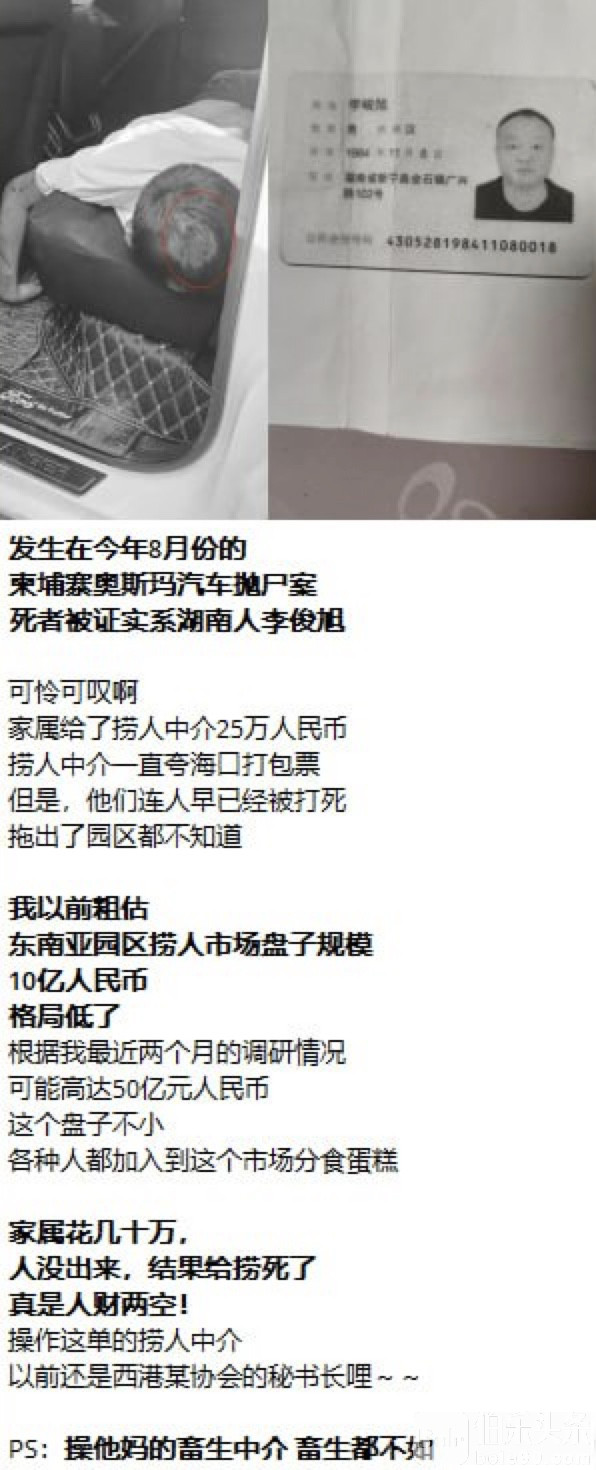 伯乐头条专讯:柬埔寨奥多棉芷园区近日发生惨剧,一中国人李峻旭在电诈园区被打死,其父李滔滔控诉,中国男子张某勇(代号向前)冒充省厅外勤,自称“解救专家”,以解救少年为由诈骗家属25万元人民币。