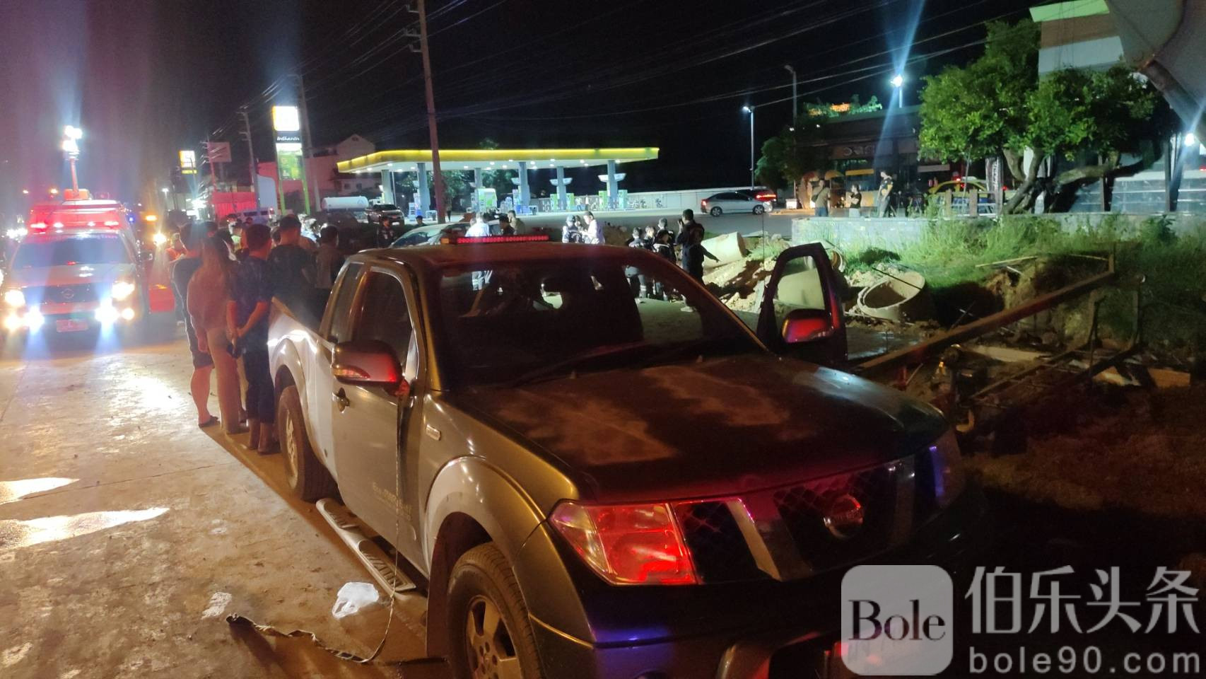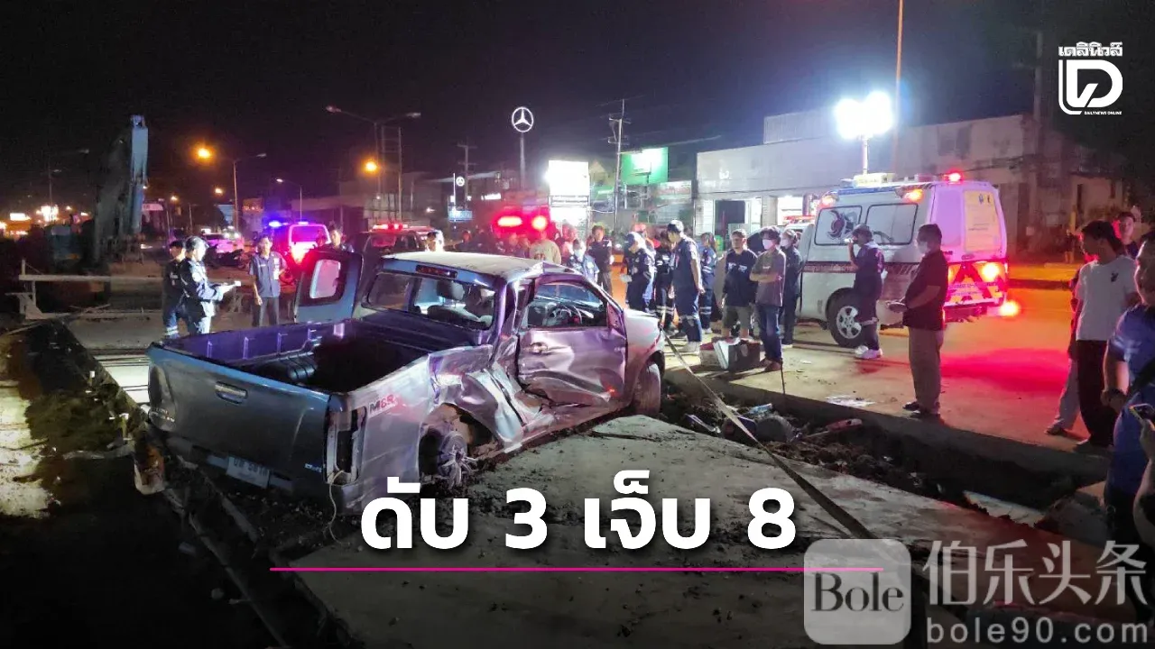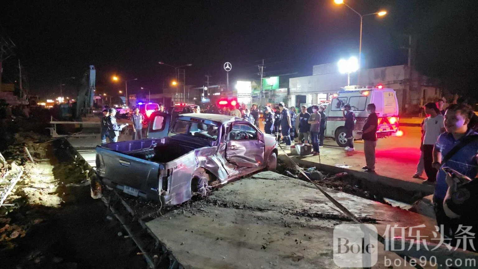 事故发生于11月6日晚,地点位于碧差汶府市区友谊路靠近Bangchak加油站区域。现场一辆灰色Isuzu D-Max皮卡(车牌号:บล 5818)撞毁严重,车内1名高龄女性当场死亡,3名成年人及1名儿童受伤,被送医抢救后又有1名女性伤者不幸身亡。