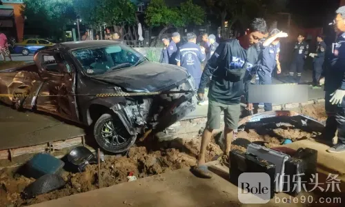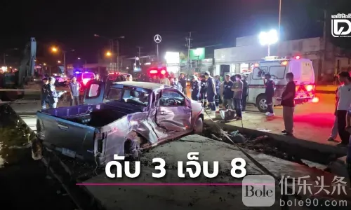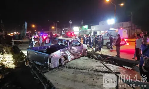 伯乐头条专讯:泰国碧差汶府一段国道发生惨烈车祸,因两辆皮卡竞速相撞,先后撞上摩托车及路边施工车辆,造成3人当场死亡,另有8人受伤。警方迅速控制事故现场,将两名肇事司机带回审讯,展开调查并依法追责。