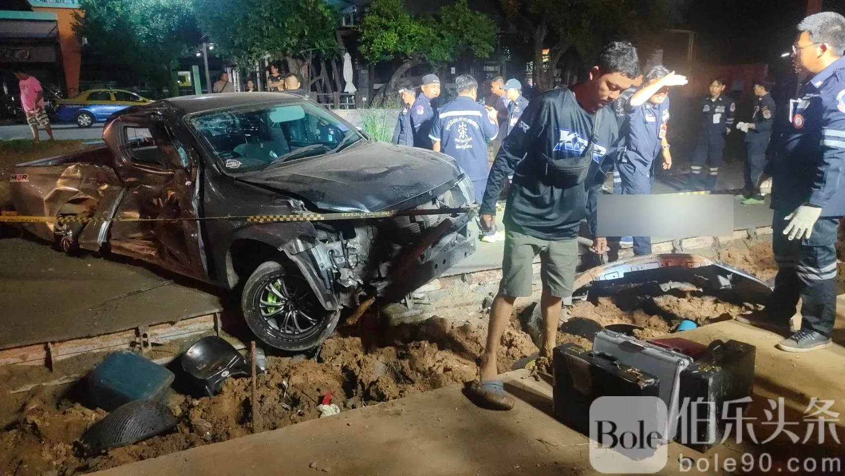 附近一辆Honda摩托车(车牌号:1 กส 6897)倒地,驾驶人重伤送医。路边停放的Nissan皮卡属于道路施工队,其车尾被撞,造成1名男性工人死亡,另4名工人受伤,均已送医院治疗。