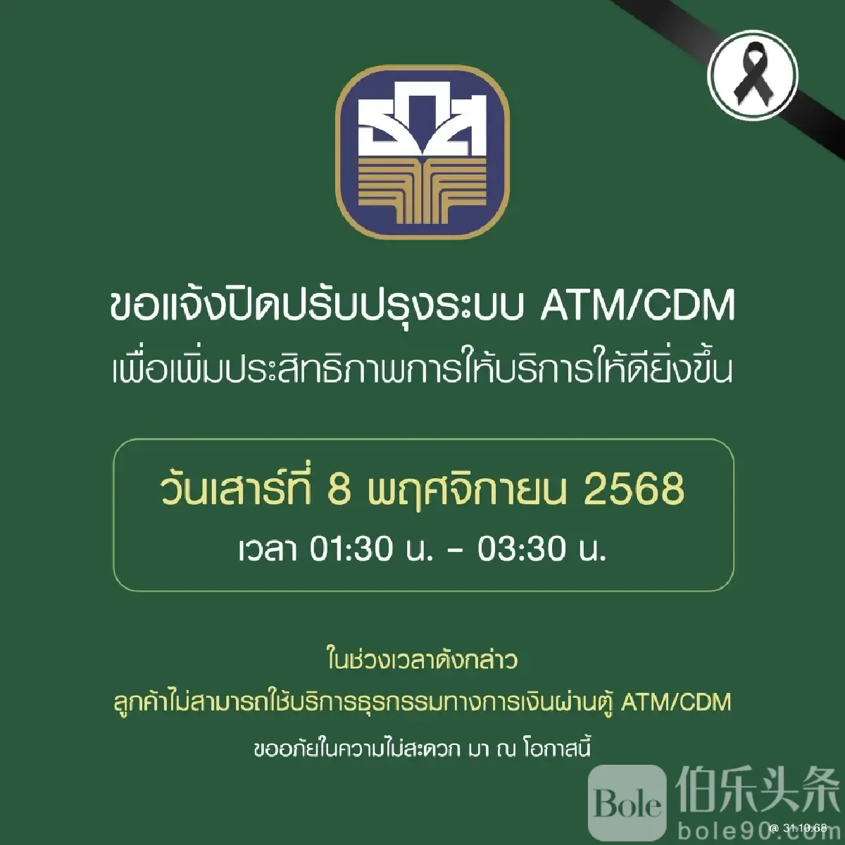 3. 农业与农业合作银行(BAAC):8日凌晨1:30至3:30暂停ATM、自动存款机及转账服务。