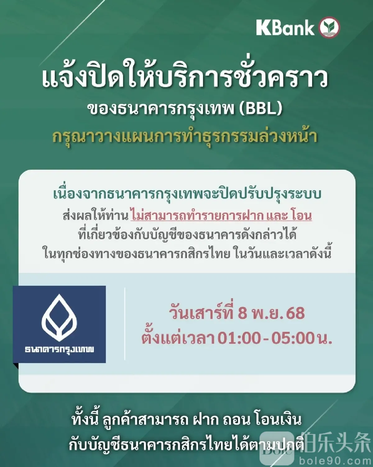 2. 泰京银行(KBank)同步公告:由于盘古银行维护,8日凌晨1:00至5:00,无法向盘古账户进行跨行转账或存款操作。