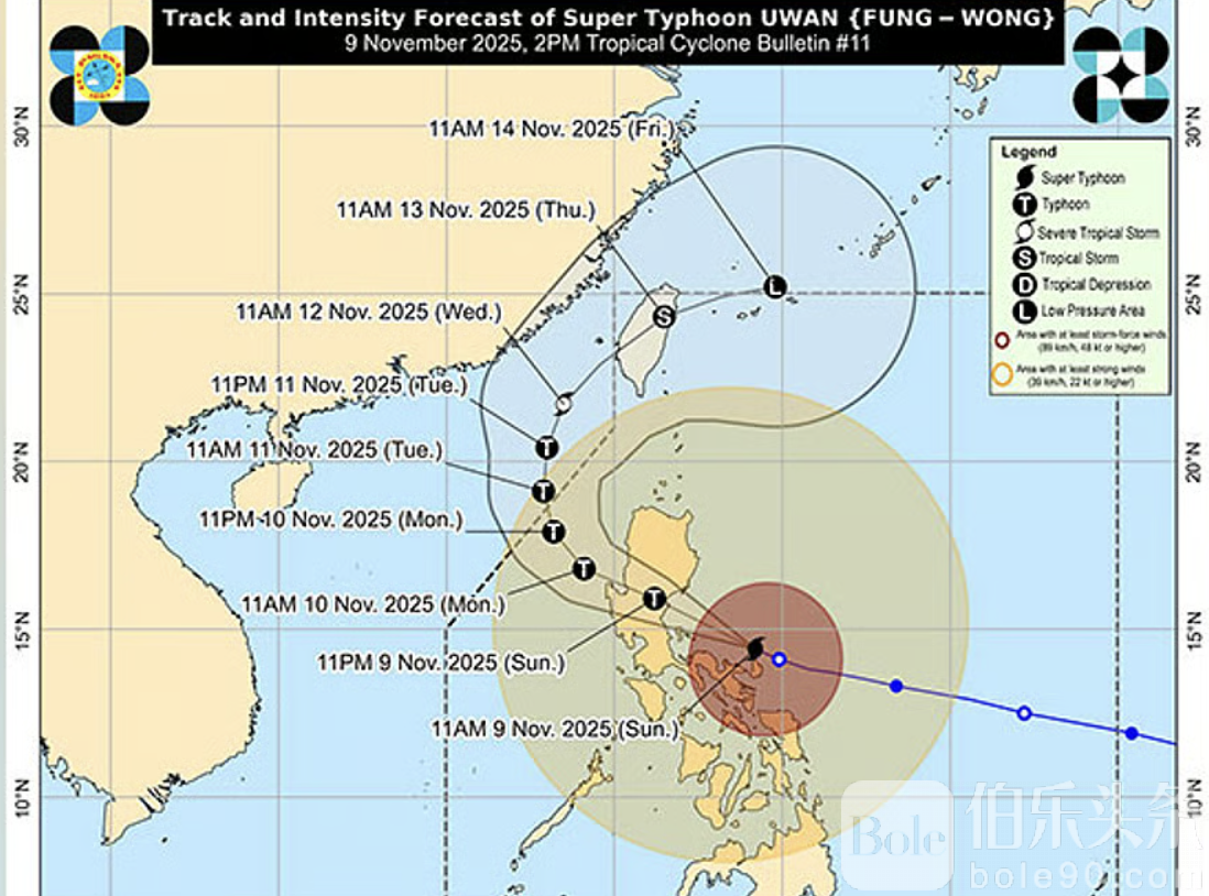 伯乐头条专讯:菲律宾中央气象局(PAGASA)通报,热带气旋“乌万”(Uwan,国际名Fung-Wong)在11月9日凌晨迅速增强,正式升级为超级台风。目前风暴中心位于卡坦端内斯岛(Catanduanes)以东约125公里处,最大持续风速高达每小时185公里,阵风可达230公里,气压降至935百帕,风圈半径扩展至800公里,几乎覆盖整个吕宋岛。