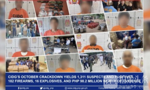 伯乐头条专讯:菲律宾国家警察刑事侦查与侦破组(CIDG)公布最新战报:2025年10月全国同步展开“猎逃缉凶”行动,期间共逮捕1311名嫌犯,查获价值超过9820万比索(约合人民币1225万元)的各类证物,成果显著。