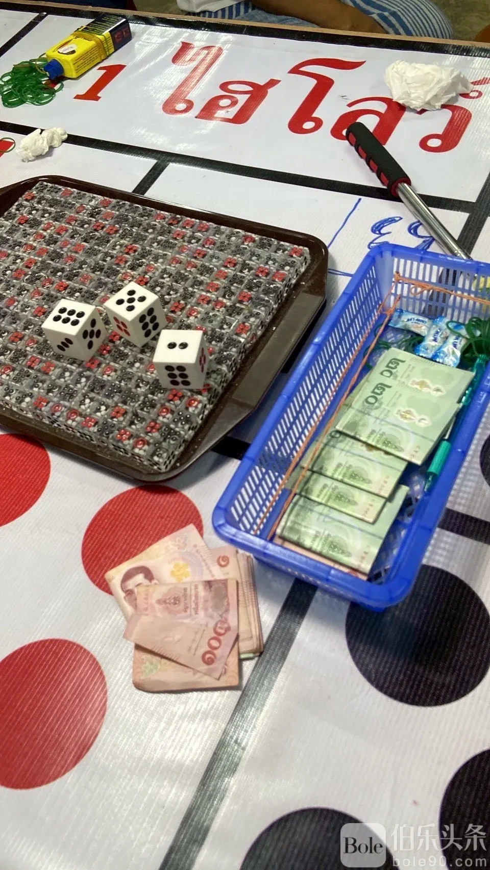 伯乐头条专讯:泰国罗勇府发生一场豪赌收网行动,当地警方联合地方政府及志愿力量,成功突袭“หรั่ง เมืองแกลง”私设的骰子赌博窝点。现场50多名赌客惊慌逃散,最终抓获24人,其中男性17人,女性7人,并缴获完整赌具及现金1,880泰铢。