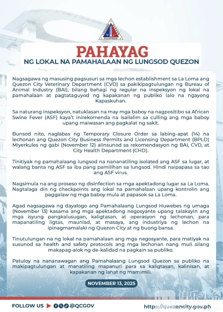 官方强调,目前疫情“仅限于拉洛玛区”,尚未扩散至其他市场。奎松市府在声明中指出,ASF病毒不会感染人类,公众无需恐慌,但呼吁市民保持警惕,避免食用来历不明的猪肉制品。