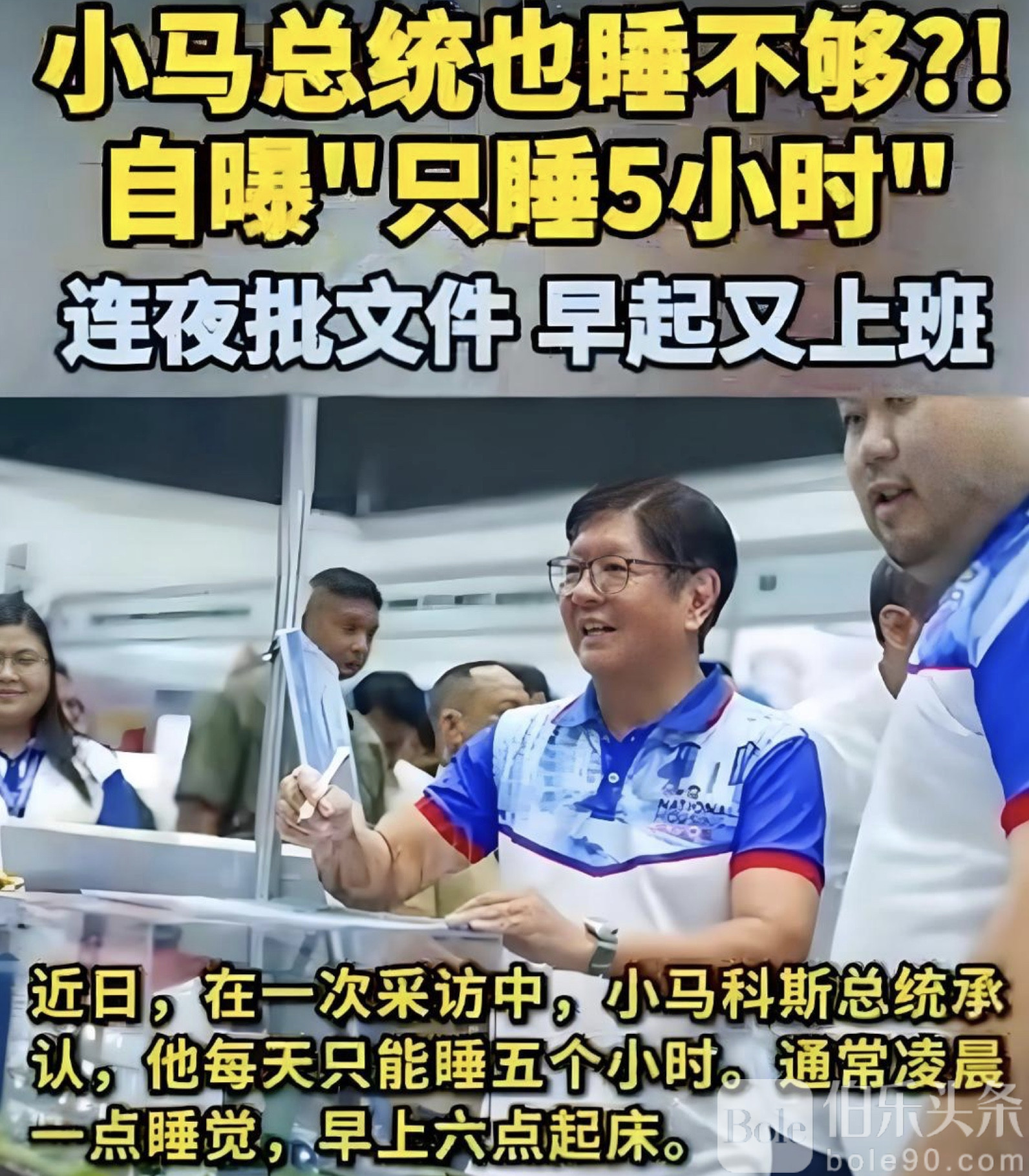 伯乐头条专讯:连菲律宾总统都成“打工人”?总统小马科斯(Ferdinand “Bongbong” Marcos Jr.)近日在接受采访时坦言,自己每天平均只睡 五个小时,经常工作到凌晨才休息,清晨又得起床上班,几乎没有时间喘息。