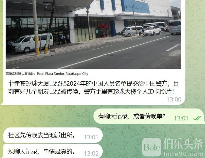 伯乐头条专讯:菲律宾马尼拉——近日,有网友在社交群组爆料称,位于马尼拉的珍珠大厦(Pearl Tower)已将2024年在大厦登记的中国籍人员名单提交给中国警方,引发部分在菲华人关注和担忧。群友表示,部分人员已收到传唤通知,称警方掌握了珍珠大厦发放的个人ID卡照片作为核查依据。目前尚无法确认名单的完整性及实际使用情况,但这一消息在华人圈内迅速传播,引起广泛讨论。
